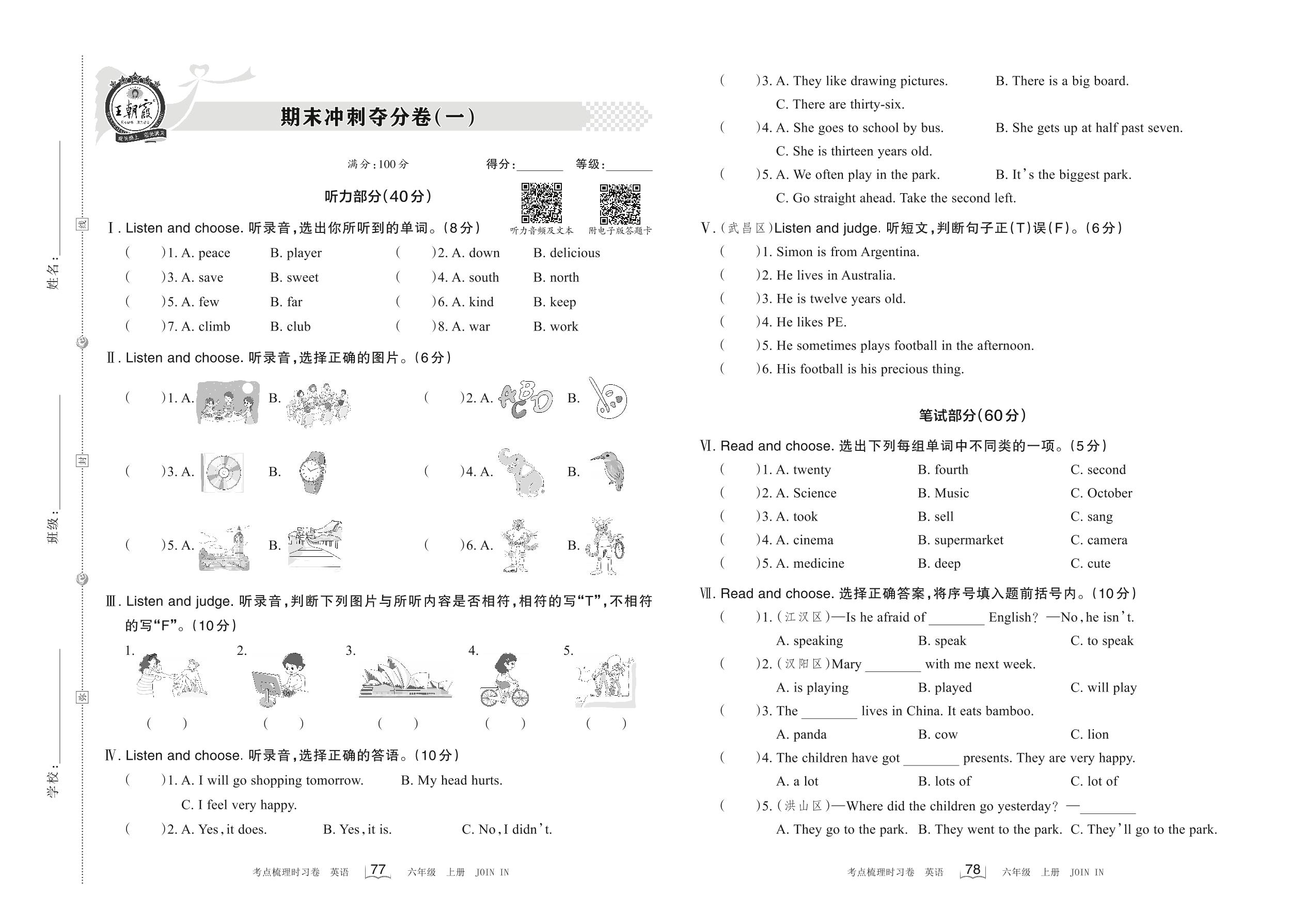 2022上册六年级英语剑桥版 期末冲刺夺分卷(一)