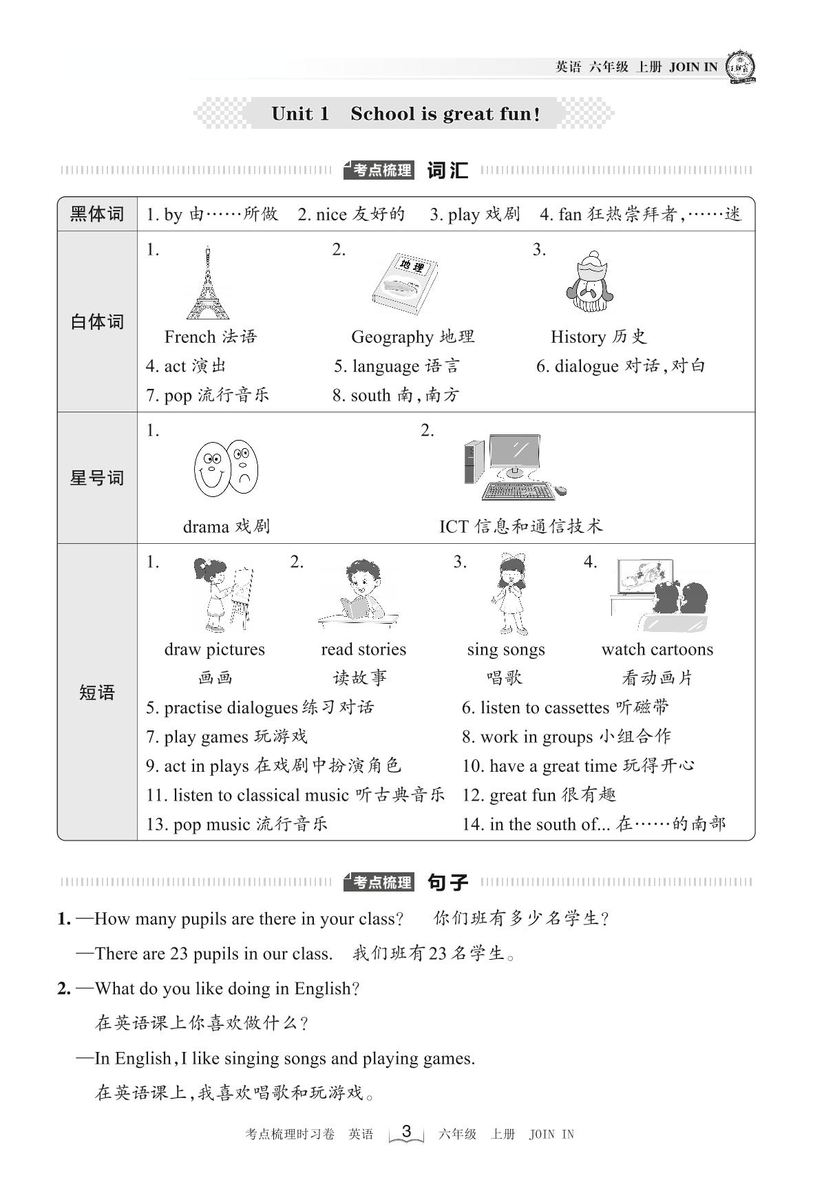 2022上册六年级英语剑桥版 考点梳理手册——Unit 1 School is great fun!