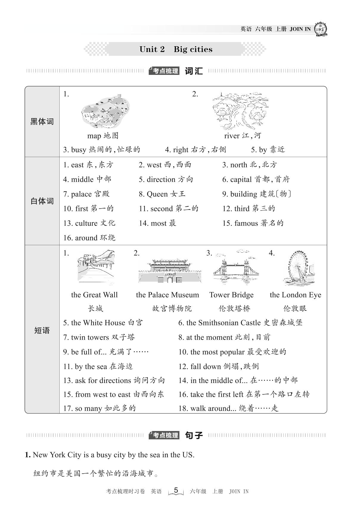 2022上册六年级英语剑桥版 考点梳理手册——Unit 2 Big cities