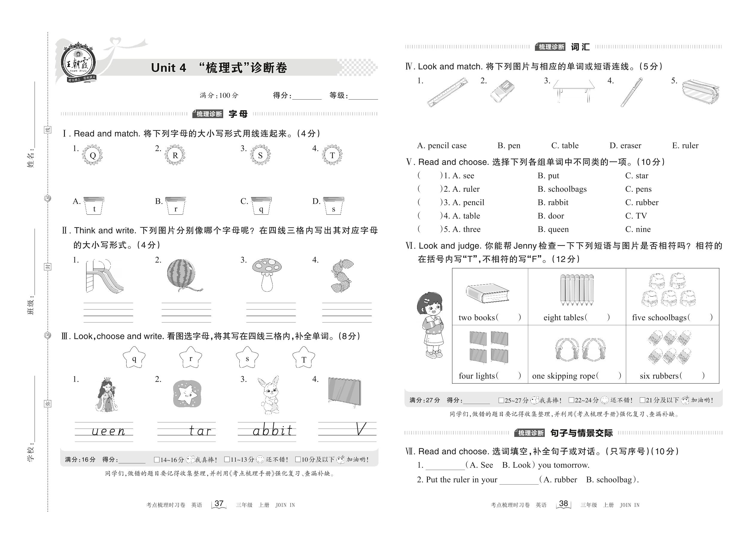 2022上册三年级英语剑桥版 Unit 4 “梳理式”诊断卷