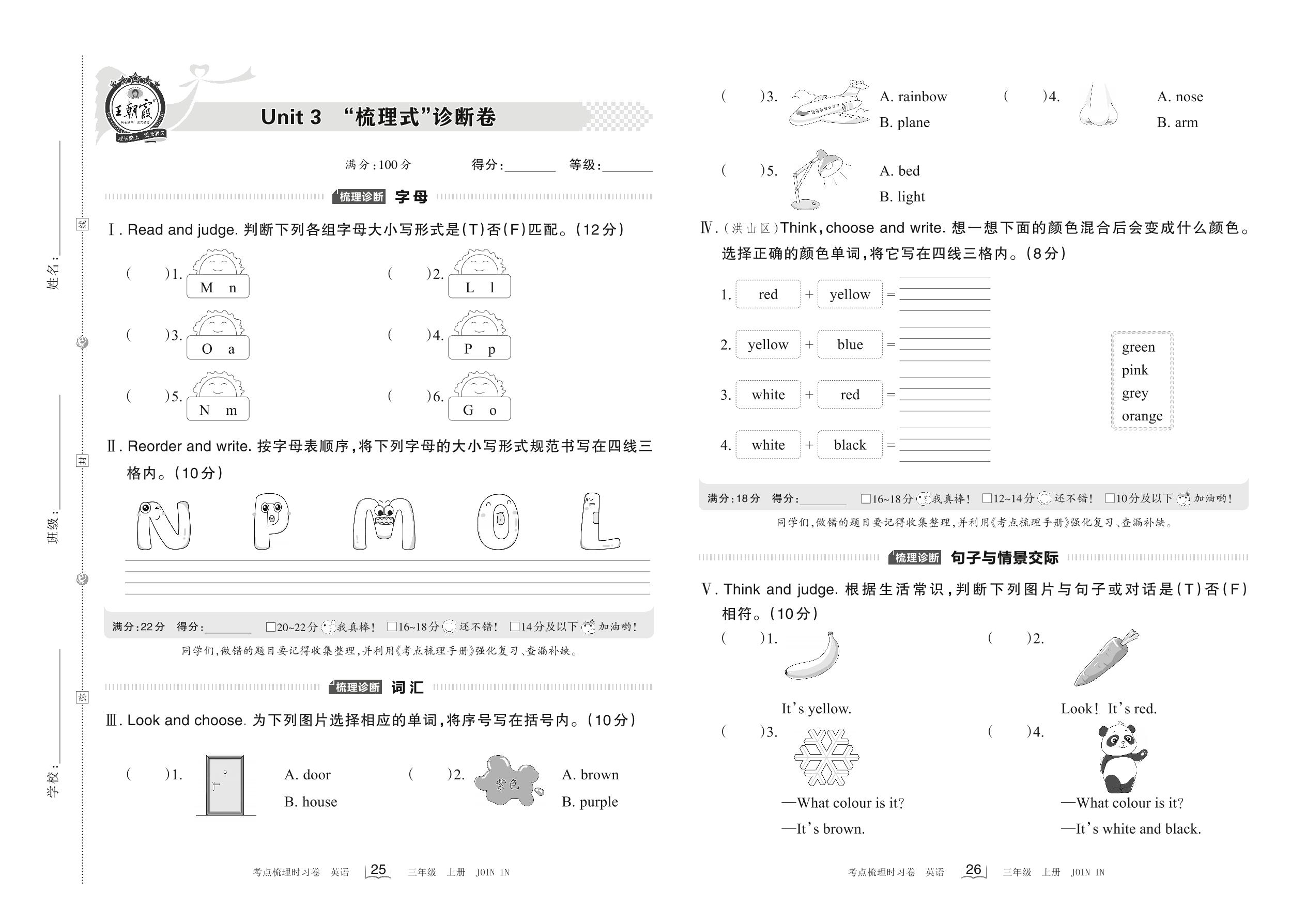 2022上册三年级英语剑桥版 Unit 3 “梳理式”诊断卷