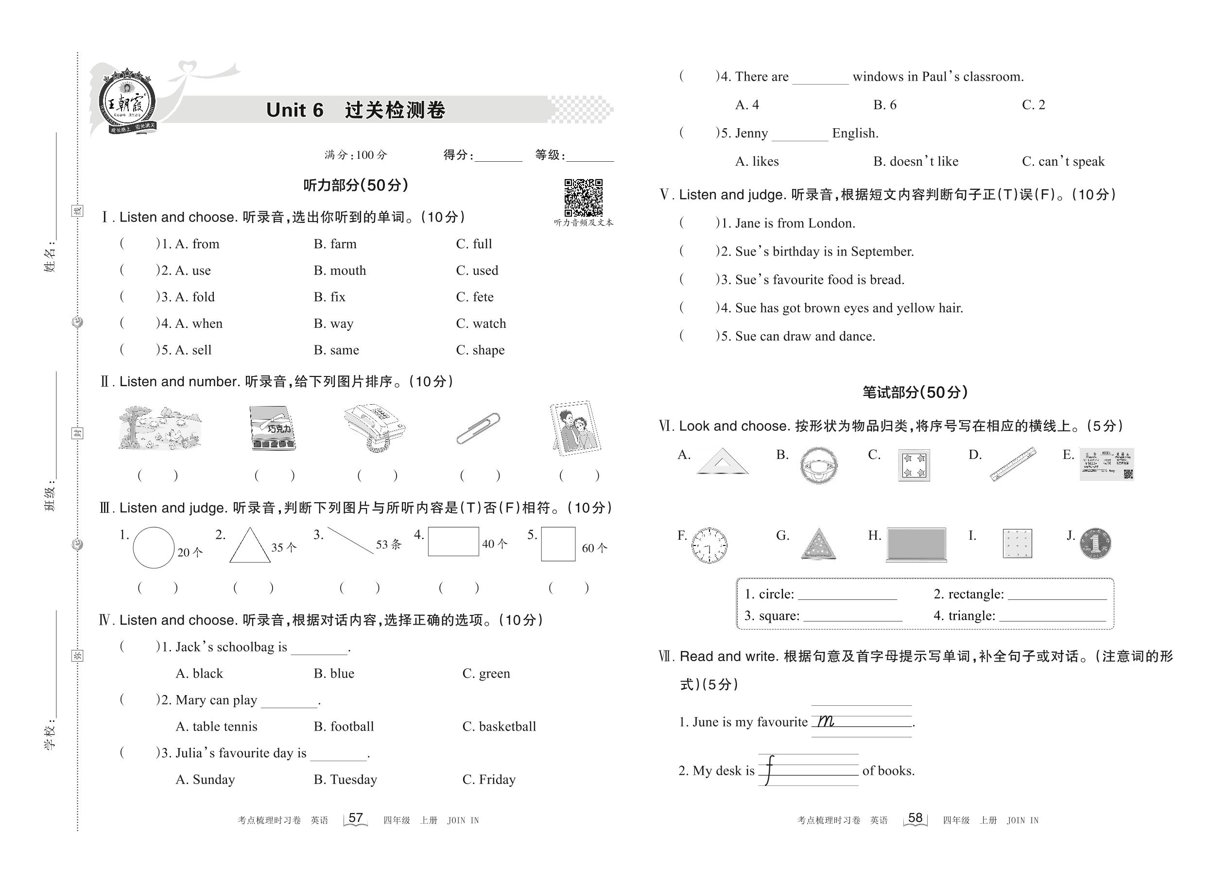 2022上册四年级英语剑桥版 Unit 6 过关检测卷