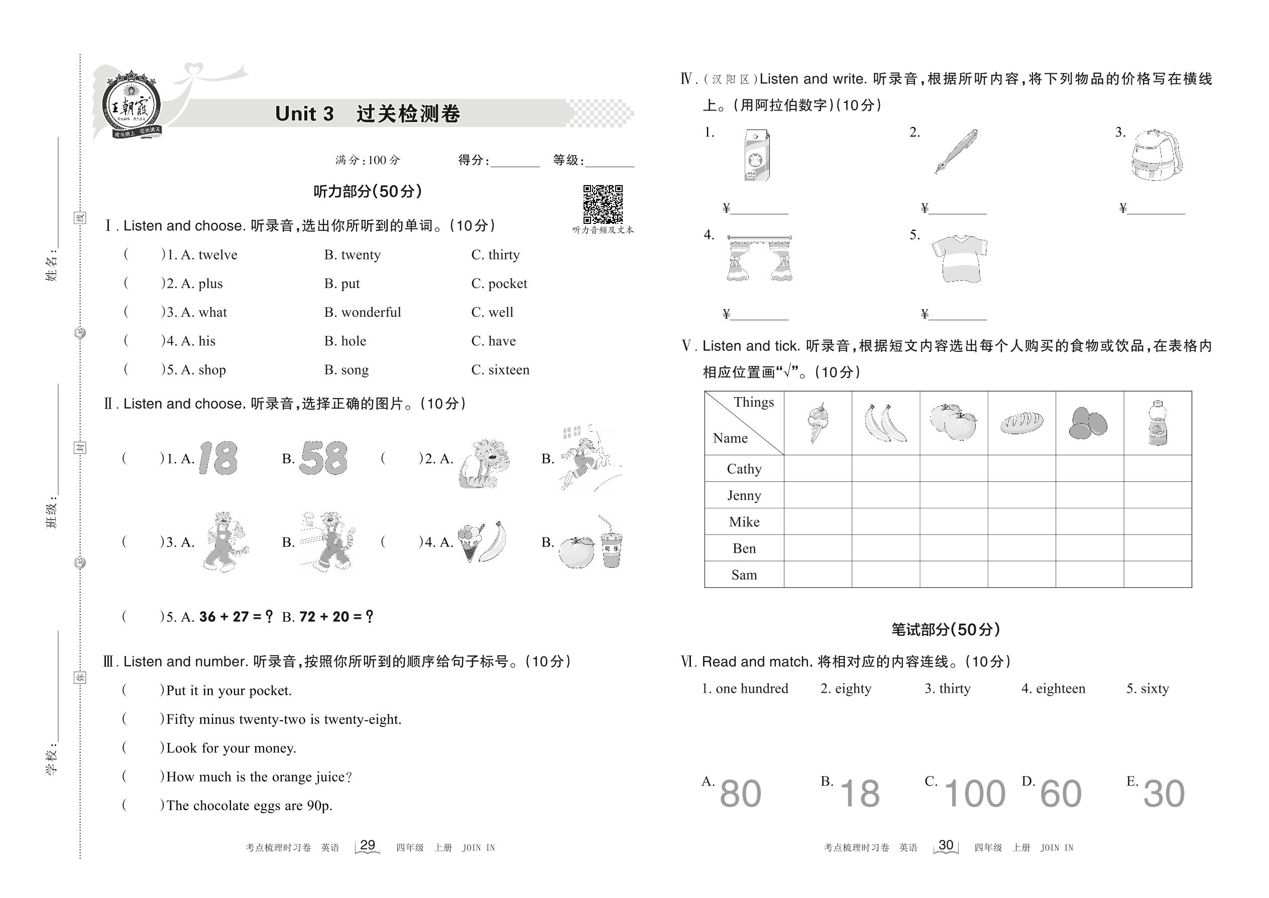2022上册四年级英语剑桥版 Unit 3 过关检测卷