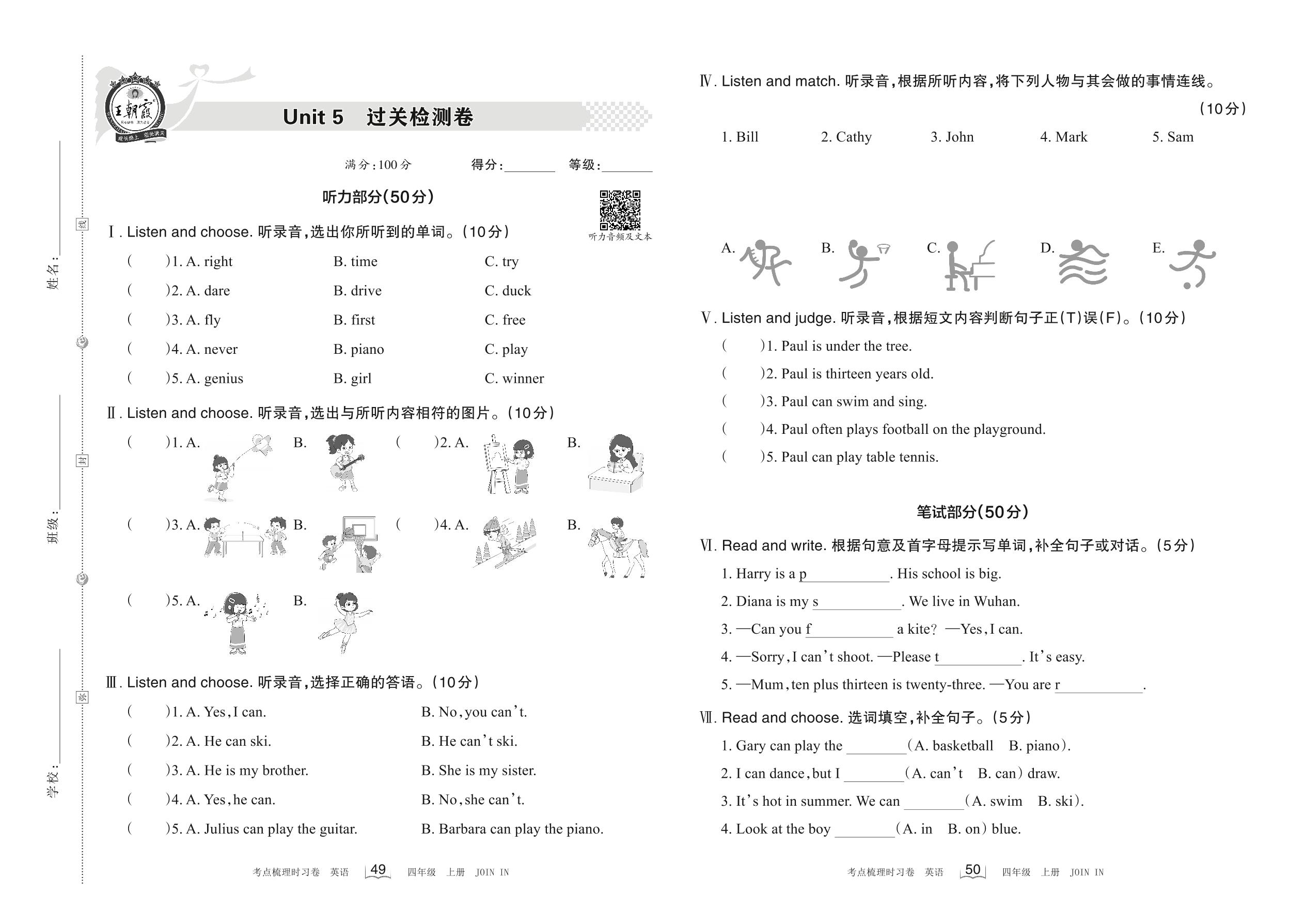2022上册四年级英语剑桥版 Unit 5 过关检测卷