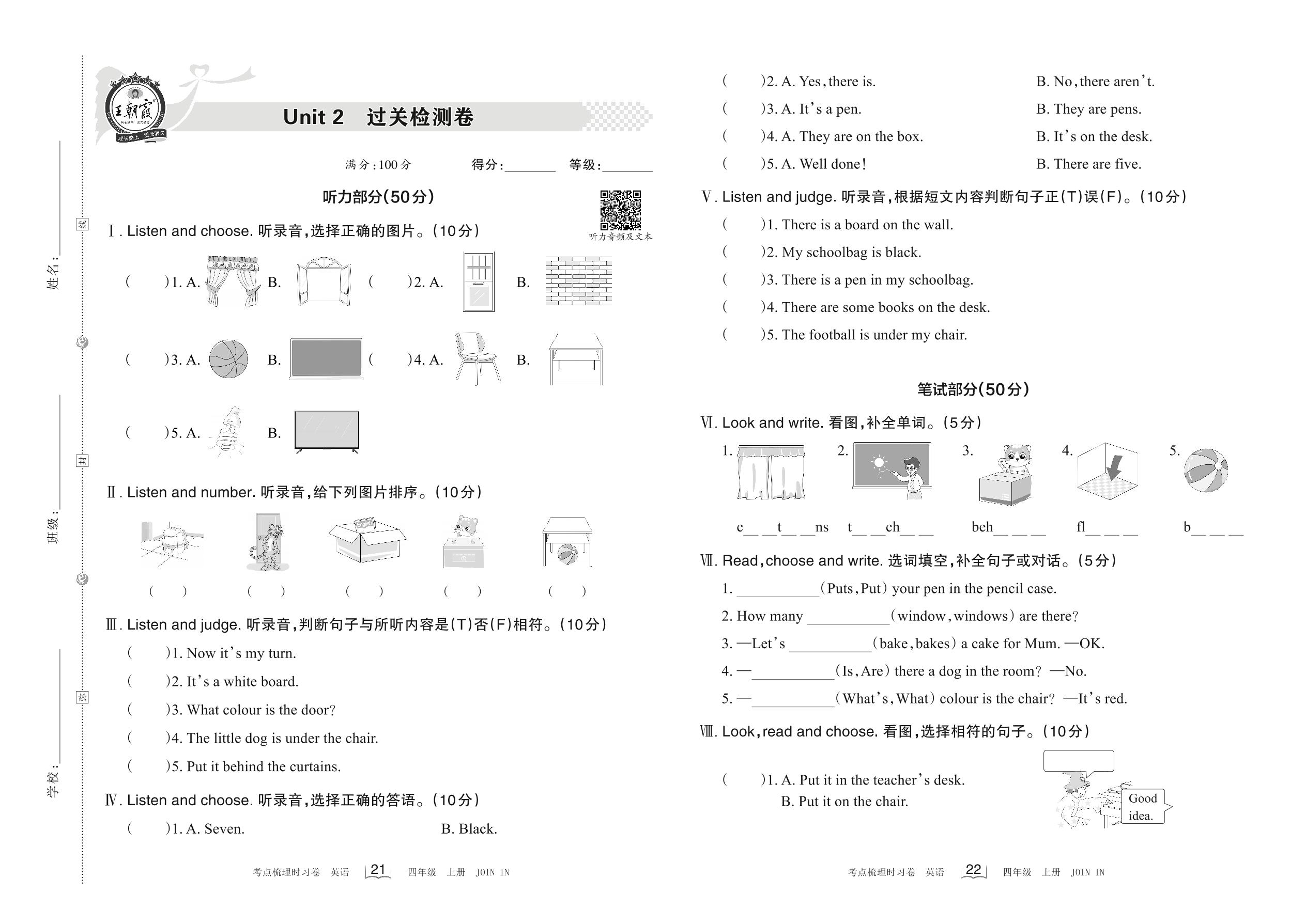 2022上册四年级英语剑桥版 Unit 2 过关检测卷