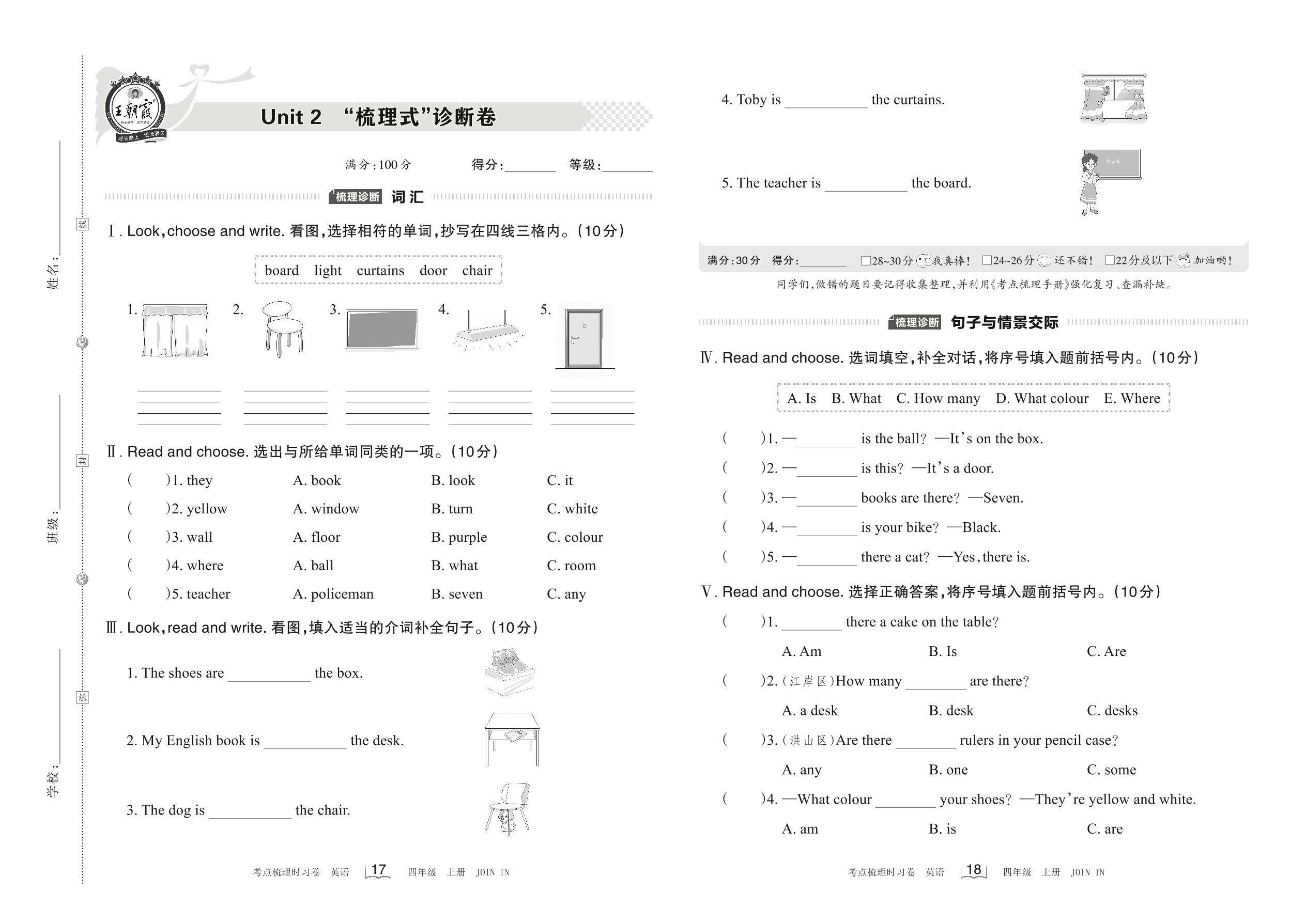 2022上册四年级英语剑桥版 Unit 2 “梳理式”诊断卷
