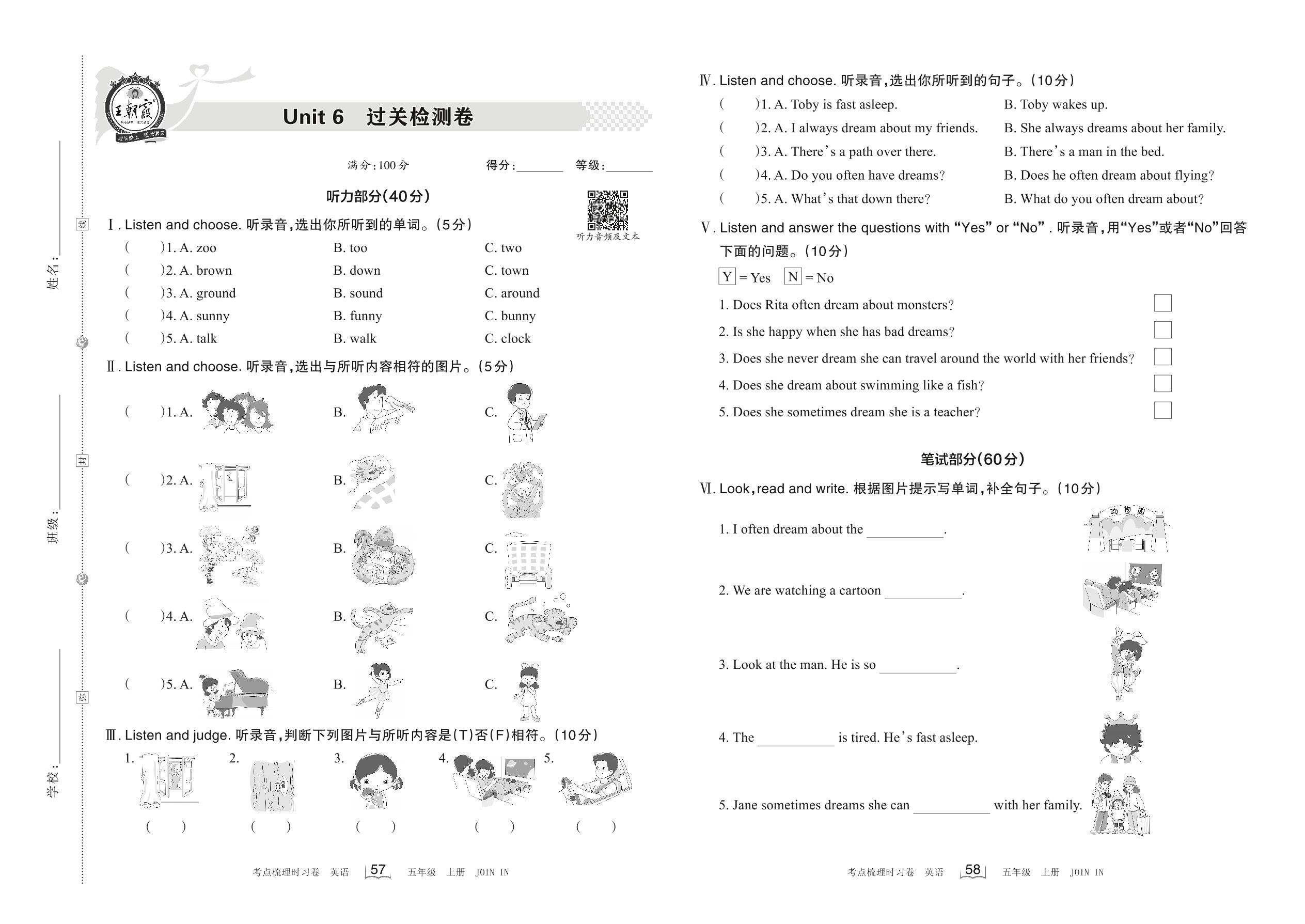 五年级英语剑桥版上册单元卷