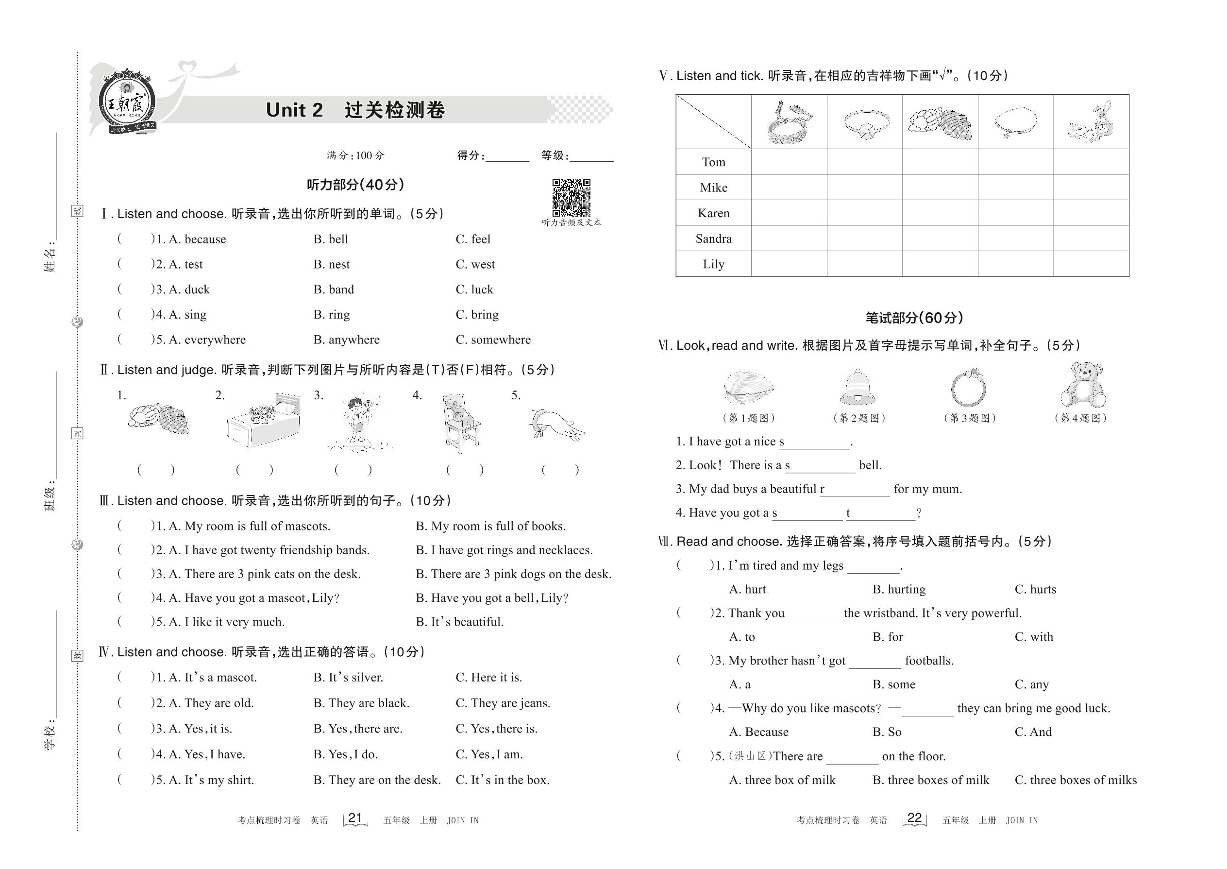 2022上册五年级英语剑桥版 Unit 2 过关检测卷