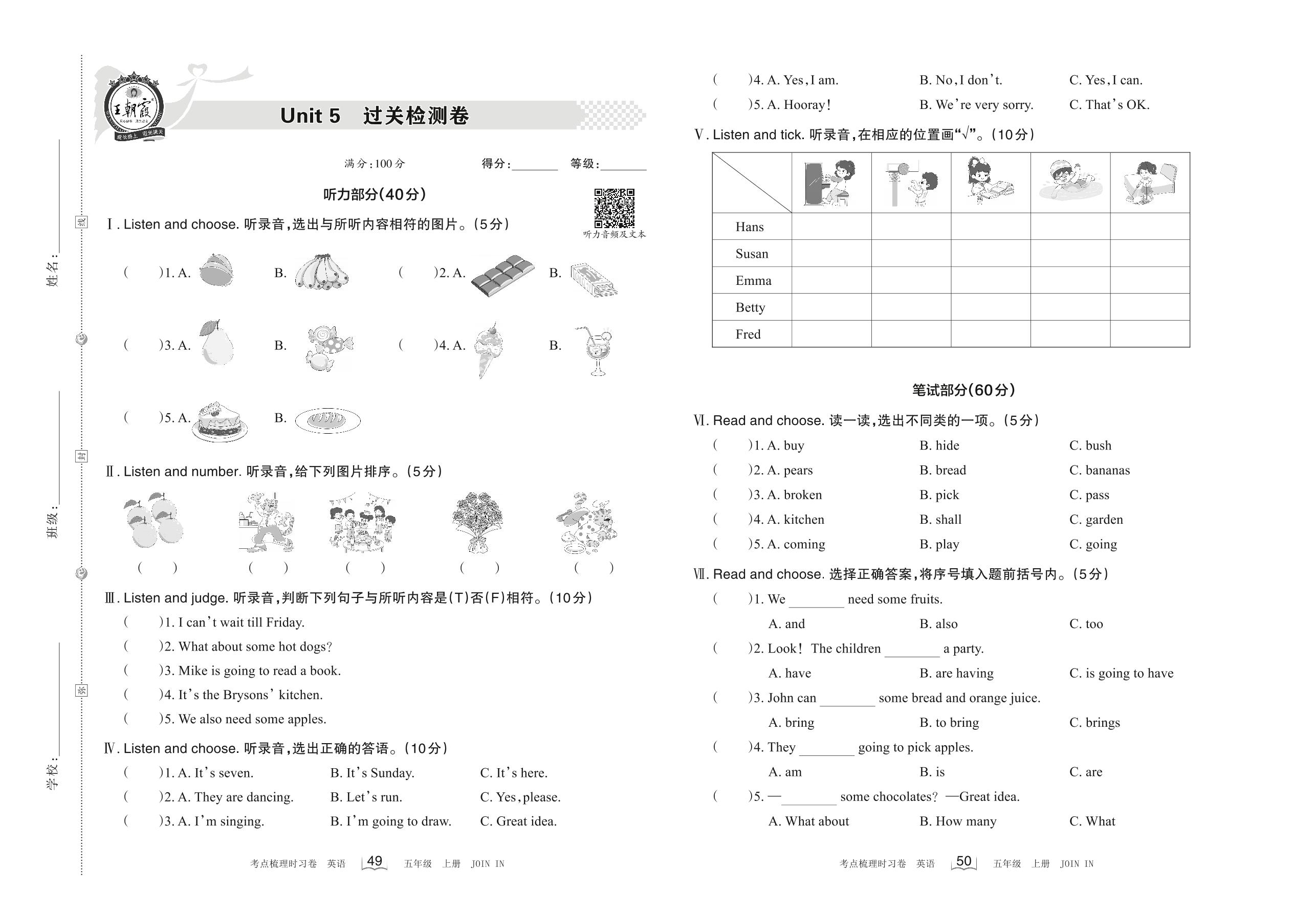 2022上册五年级英语剑桥版 Unit 5 过关检测卷