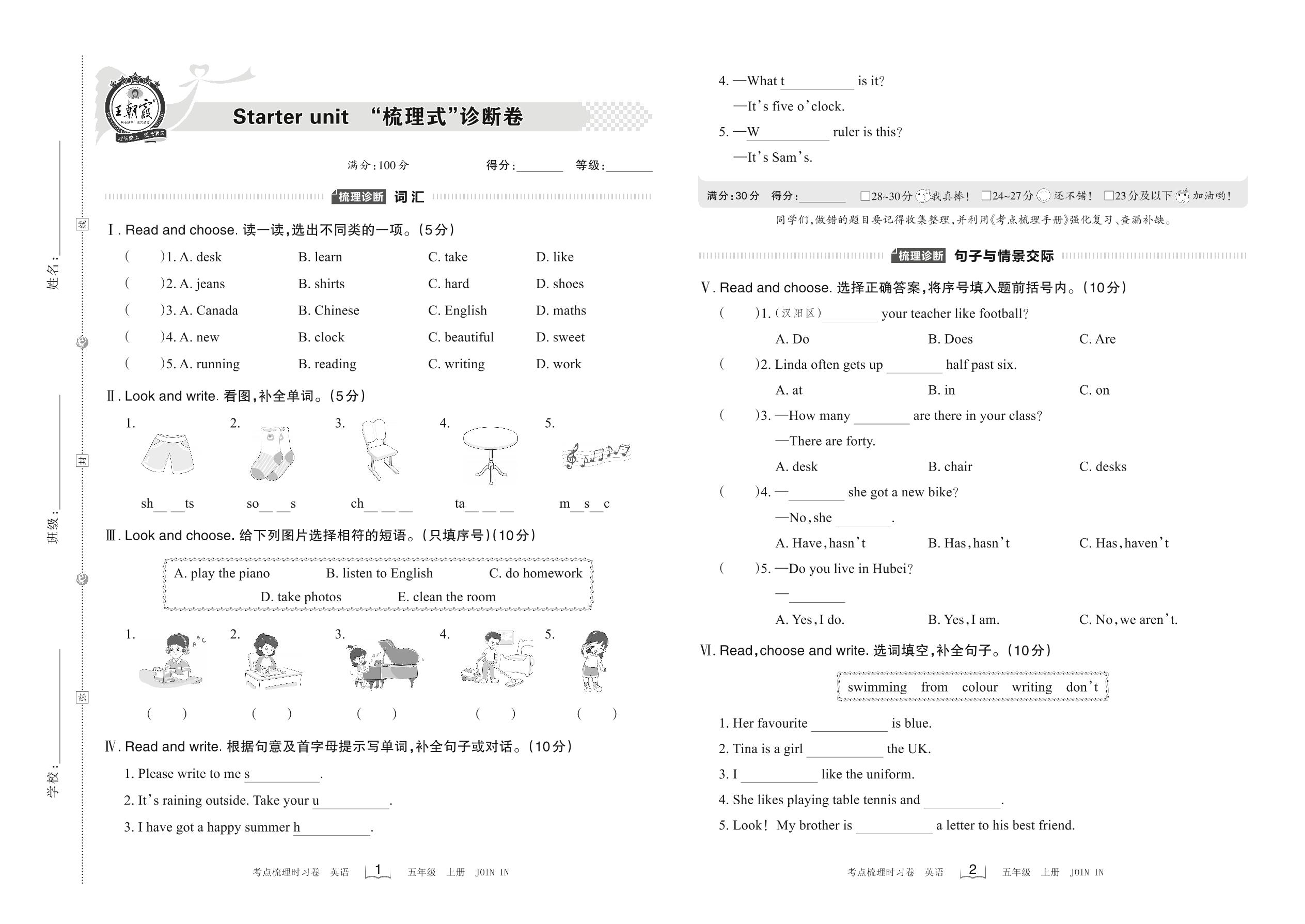2022上册五年级英语剑桥版 Starter unit “梳理式”诊断卷