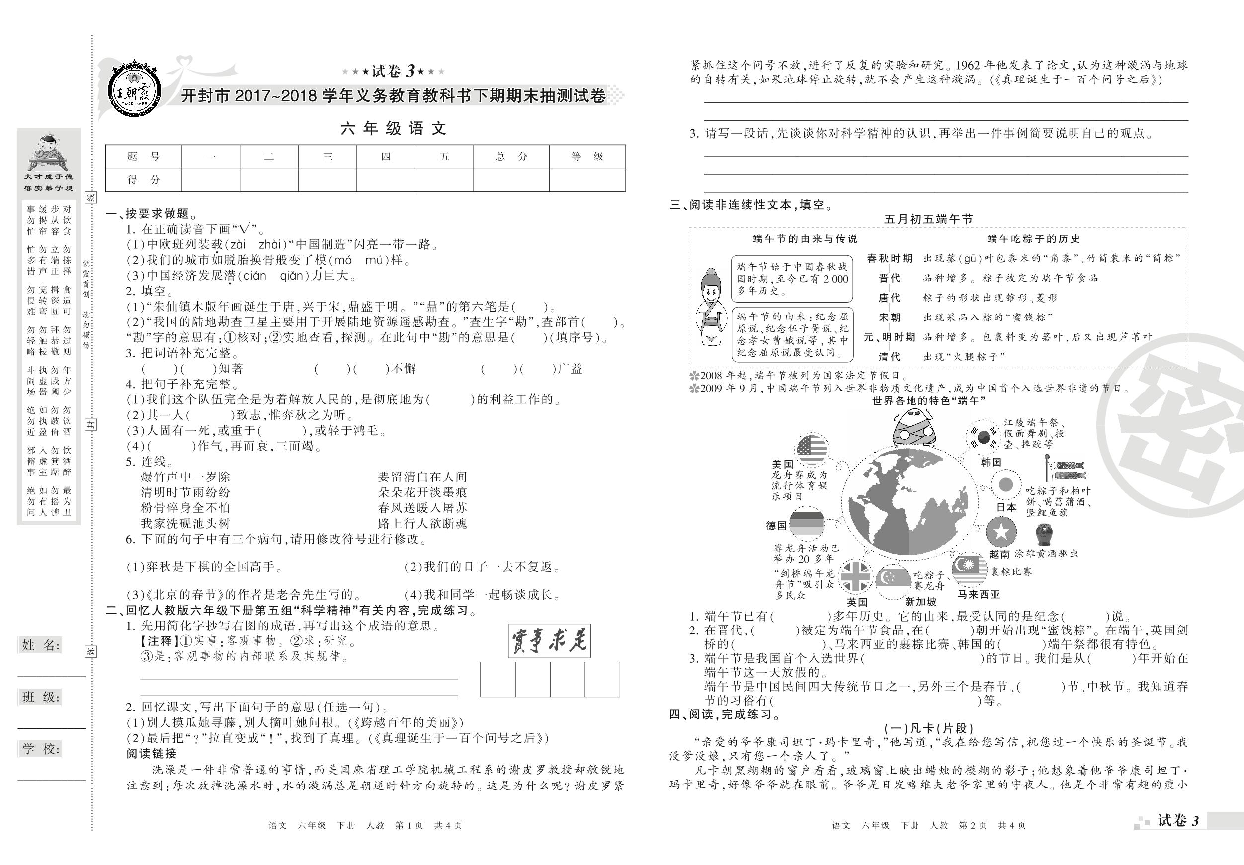 2017-2018学年第二学期开封市六年级语文试卷(人教版)【3】