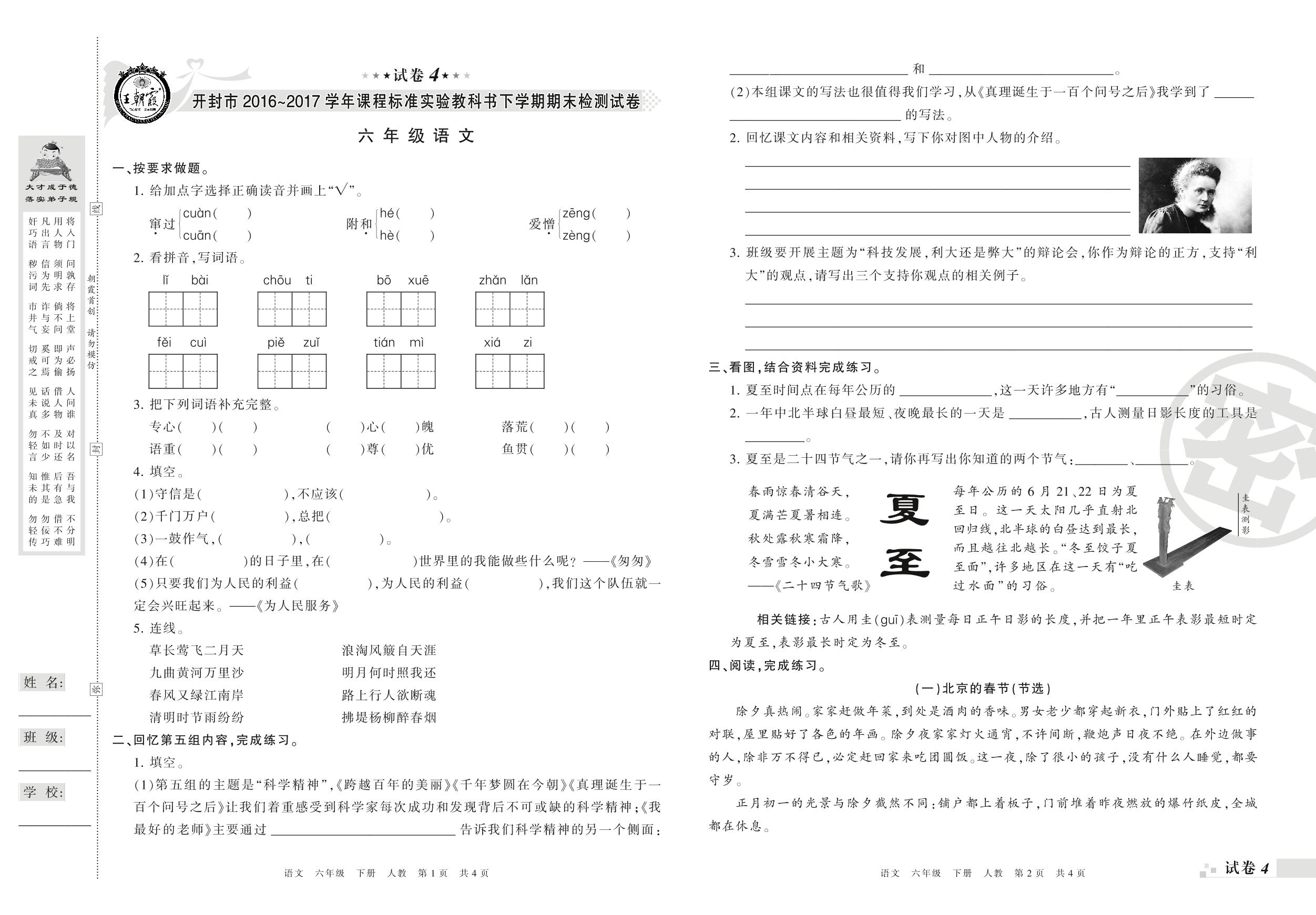 2016-2017学年第二学期开封市六年级语文试卷(人教版)【4】