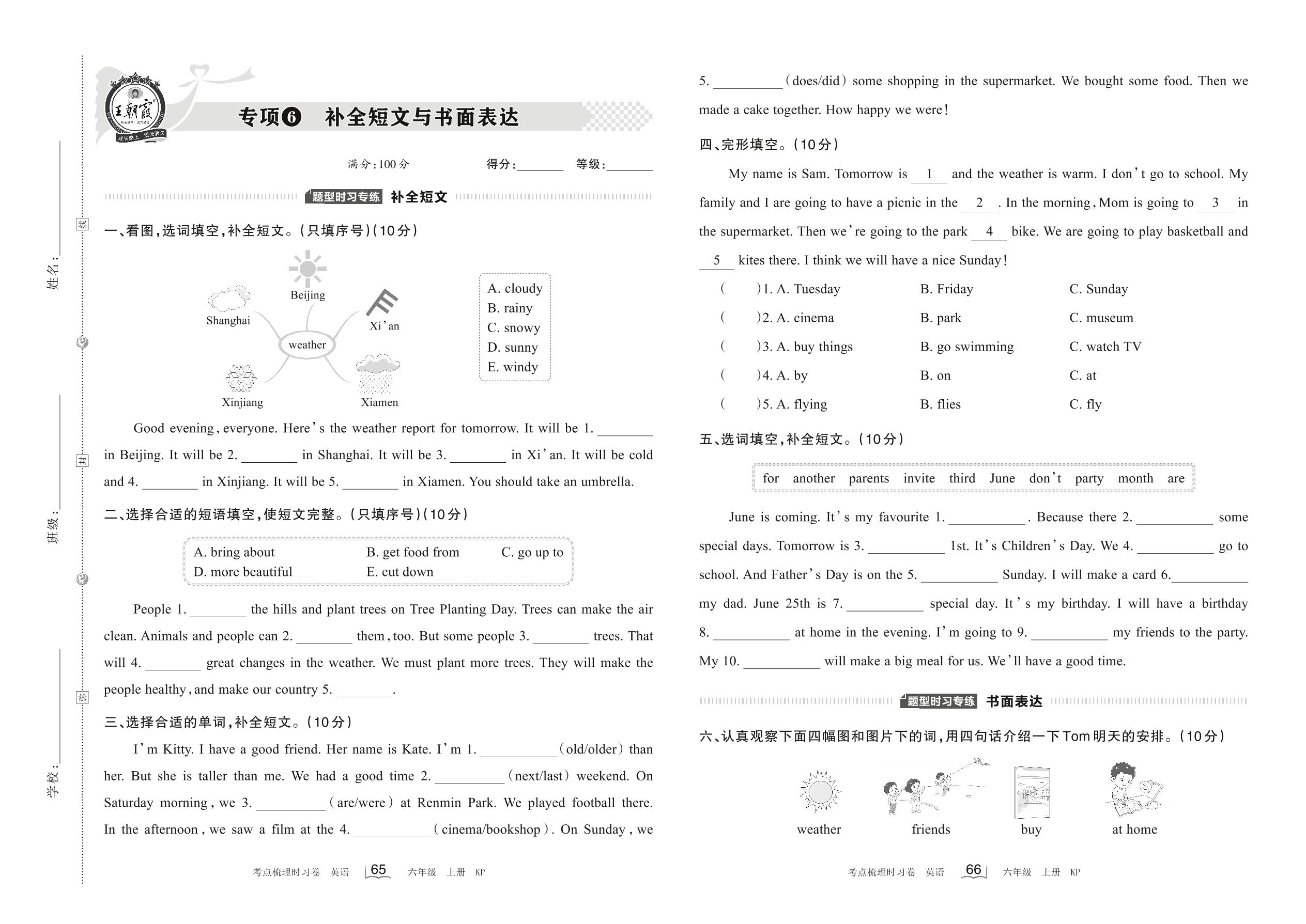 2022上册六年级英语科普版 专项6 补全短文与书面表达