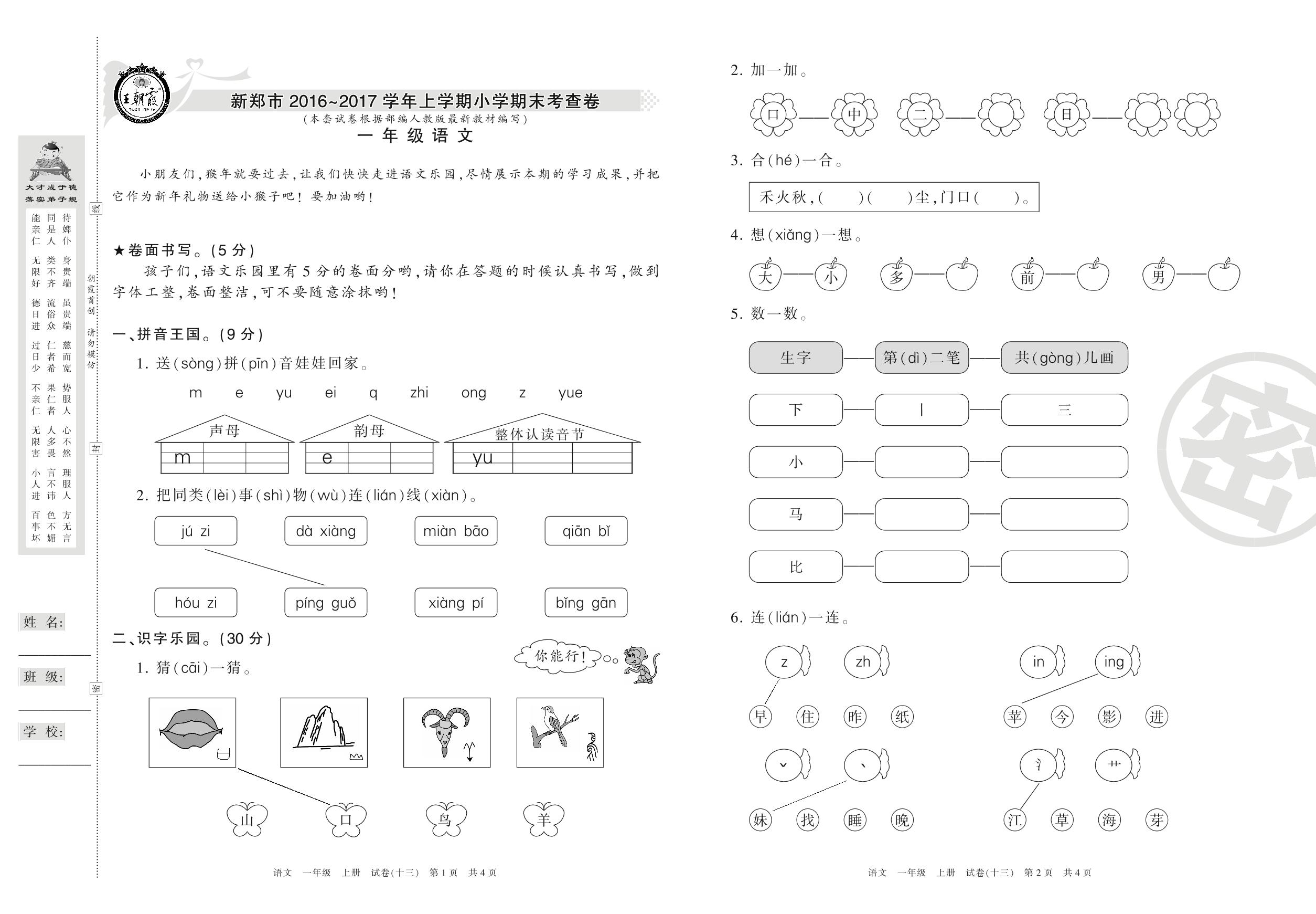 2016-2017学年第一学期新密市一年级语文试卷(人教版)【13】