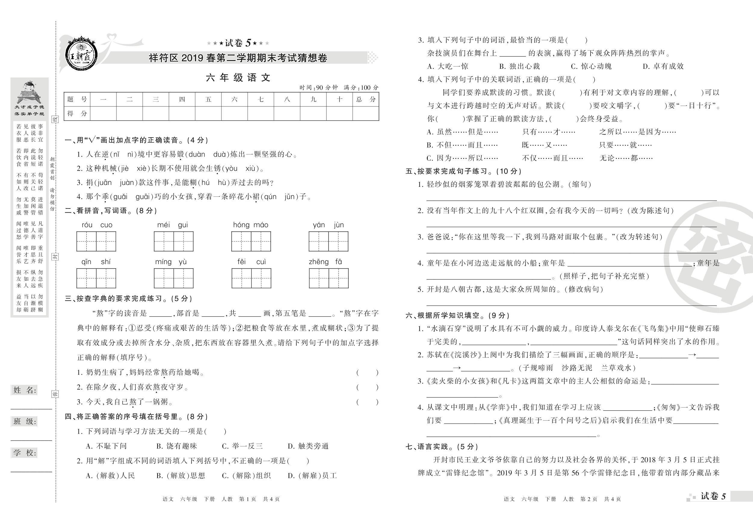 2018-2019学年第二学期开封市祥符区猜想卷六年级语文试卷(人教版)【5】