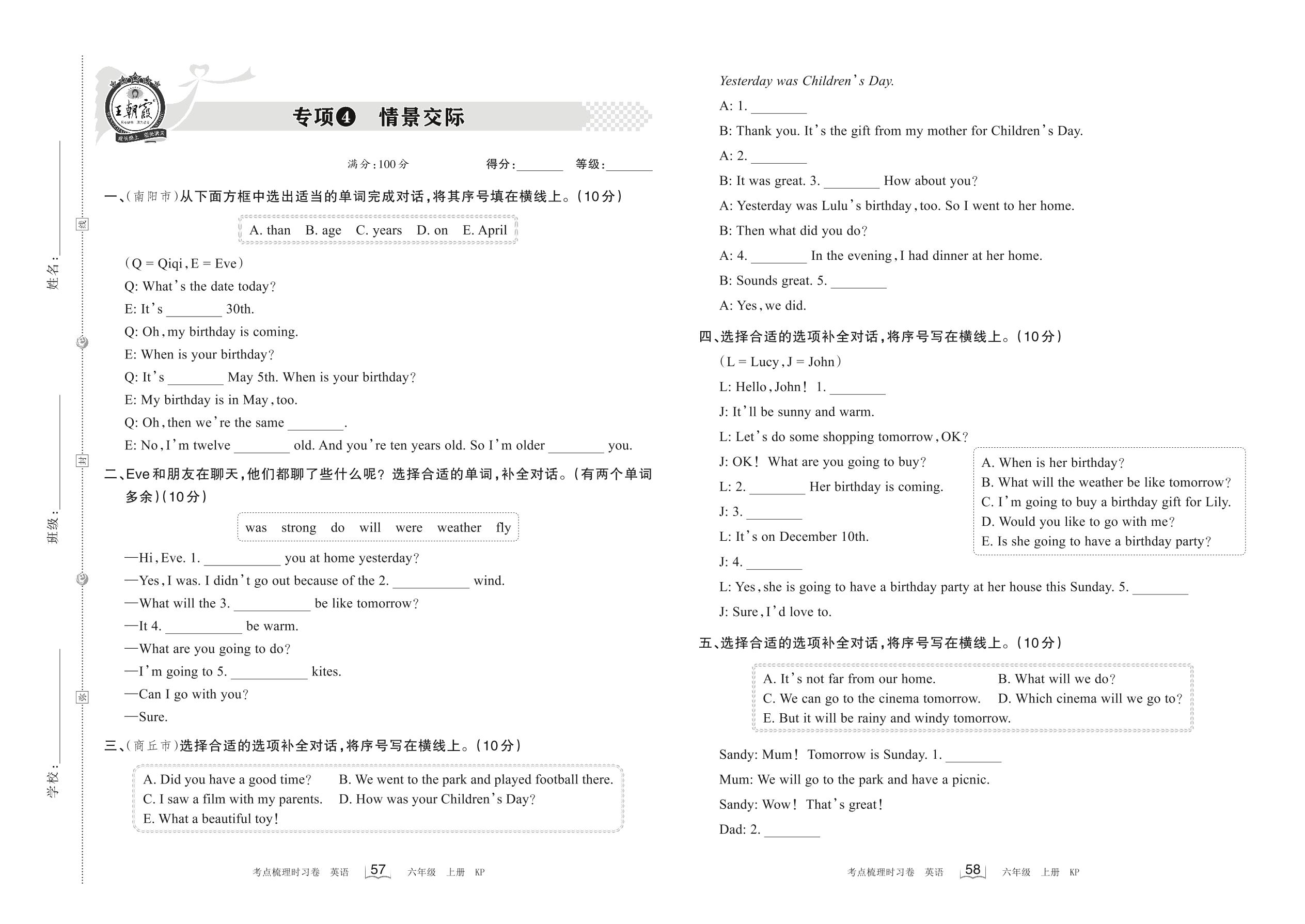 2022上册六年级英语科普版 专项4 情景交际