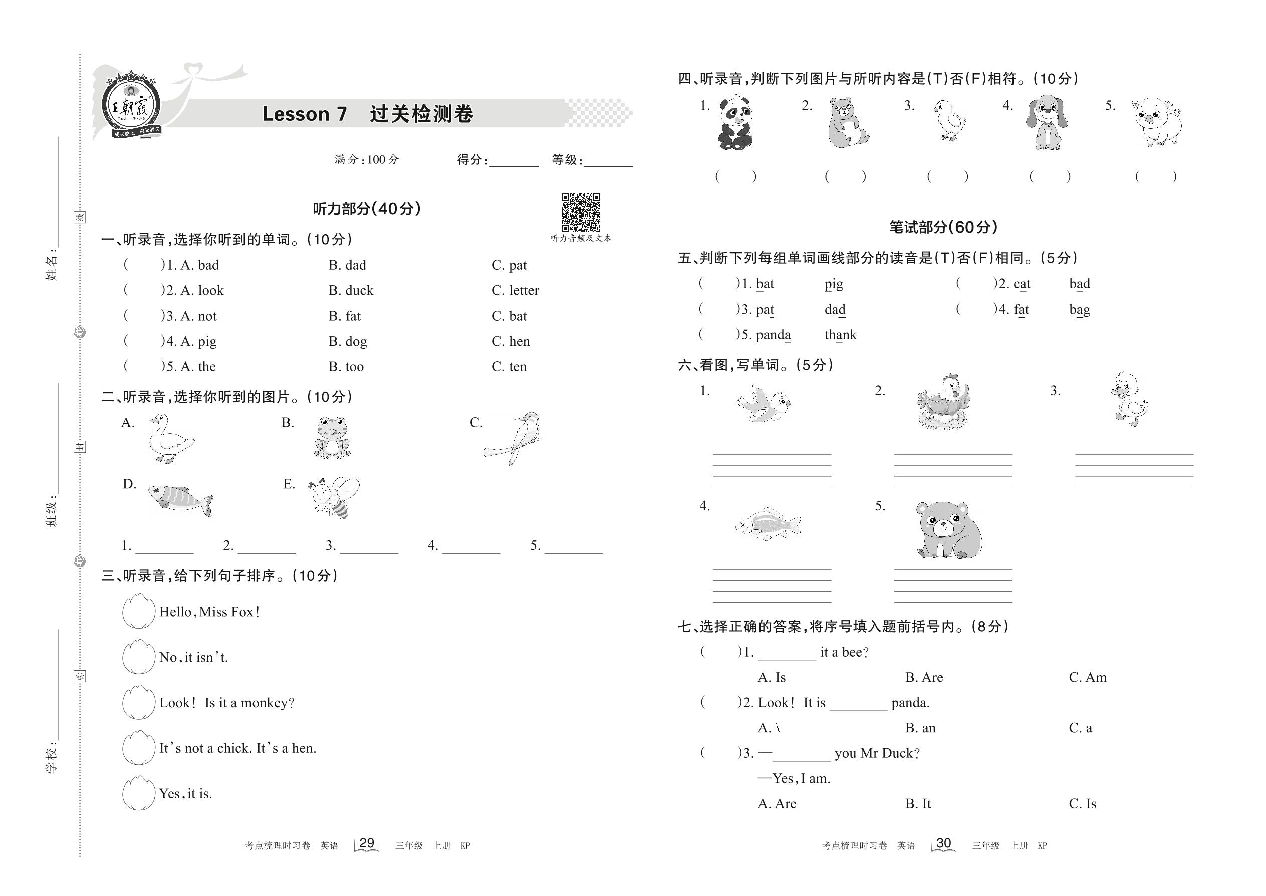 2022上册三年级英语科普版 Lesson 7 过关检测卷