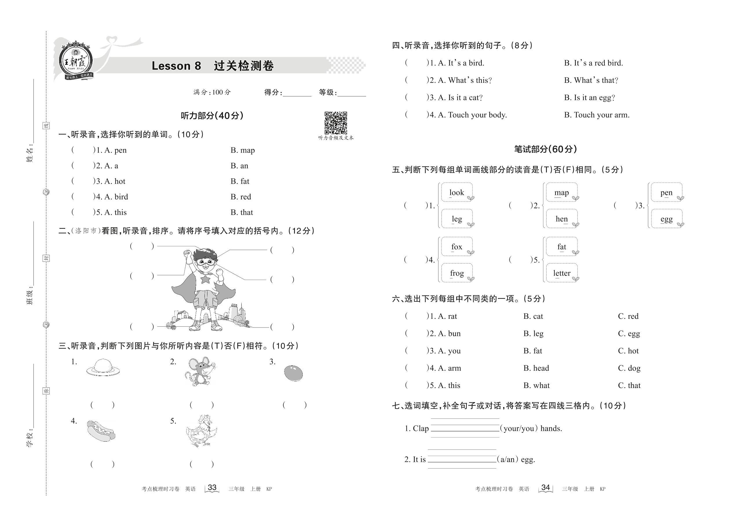 2022上册三年级英语科普版 Lesson 8 过关检测卷