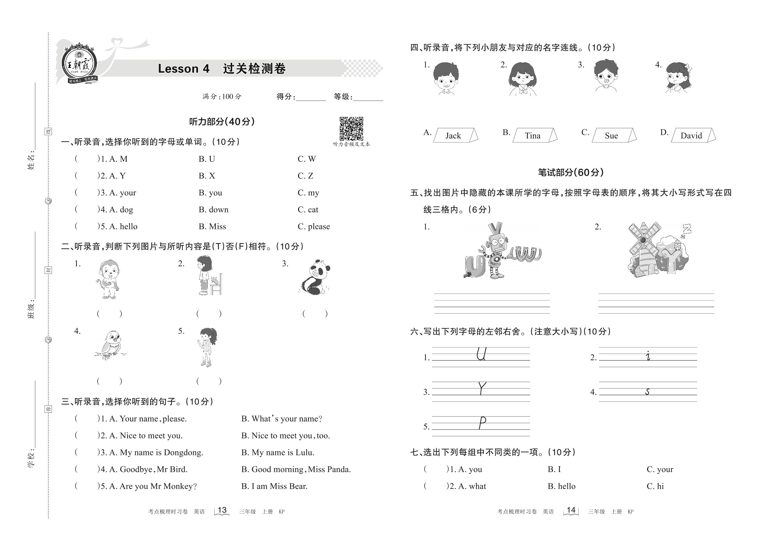 2022上册三年级英语科普版 Lesson 4 过关检测卷
