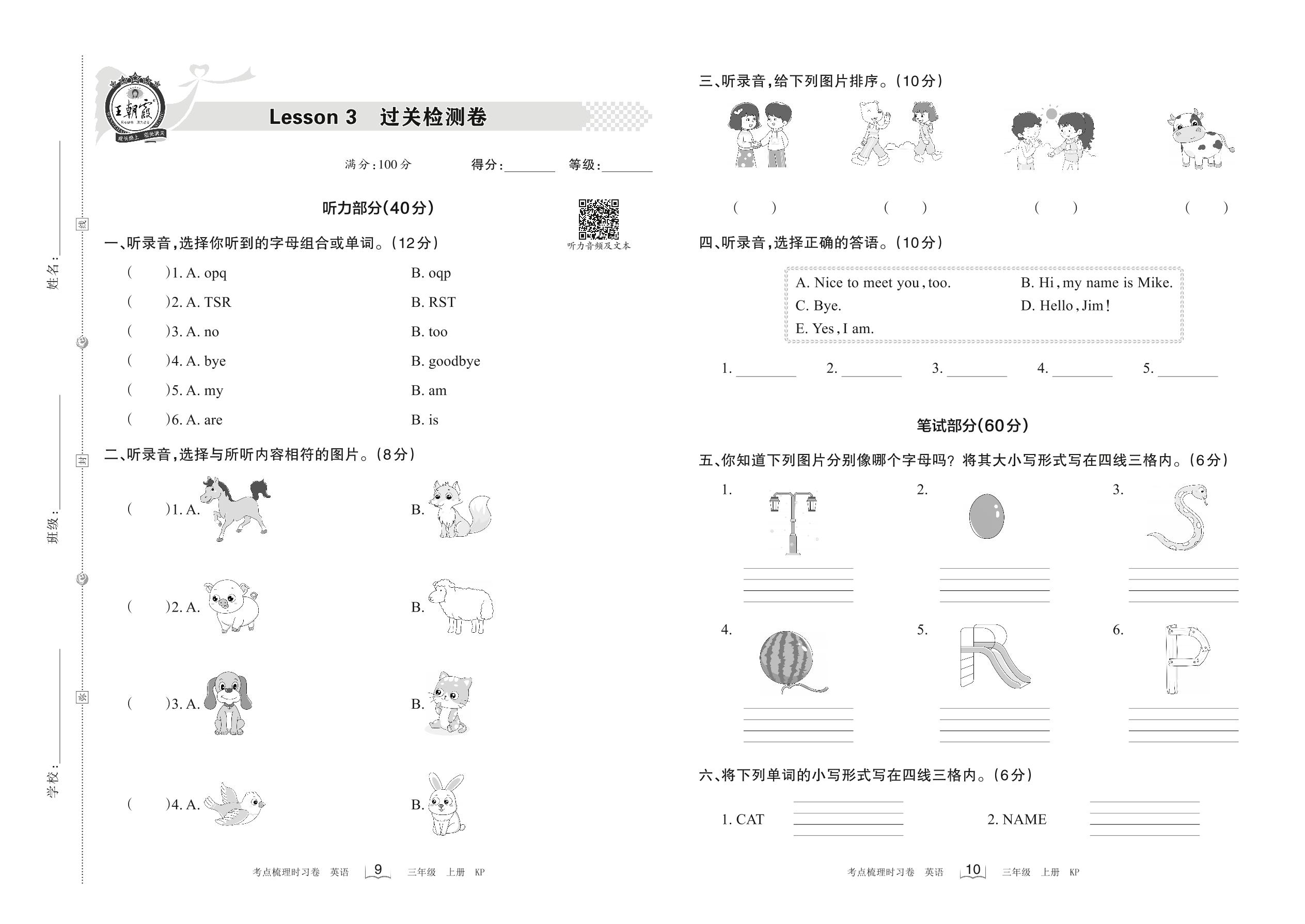 2022上册三年级英语科普版 Lesson 3 过关检测卷