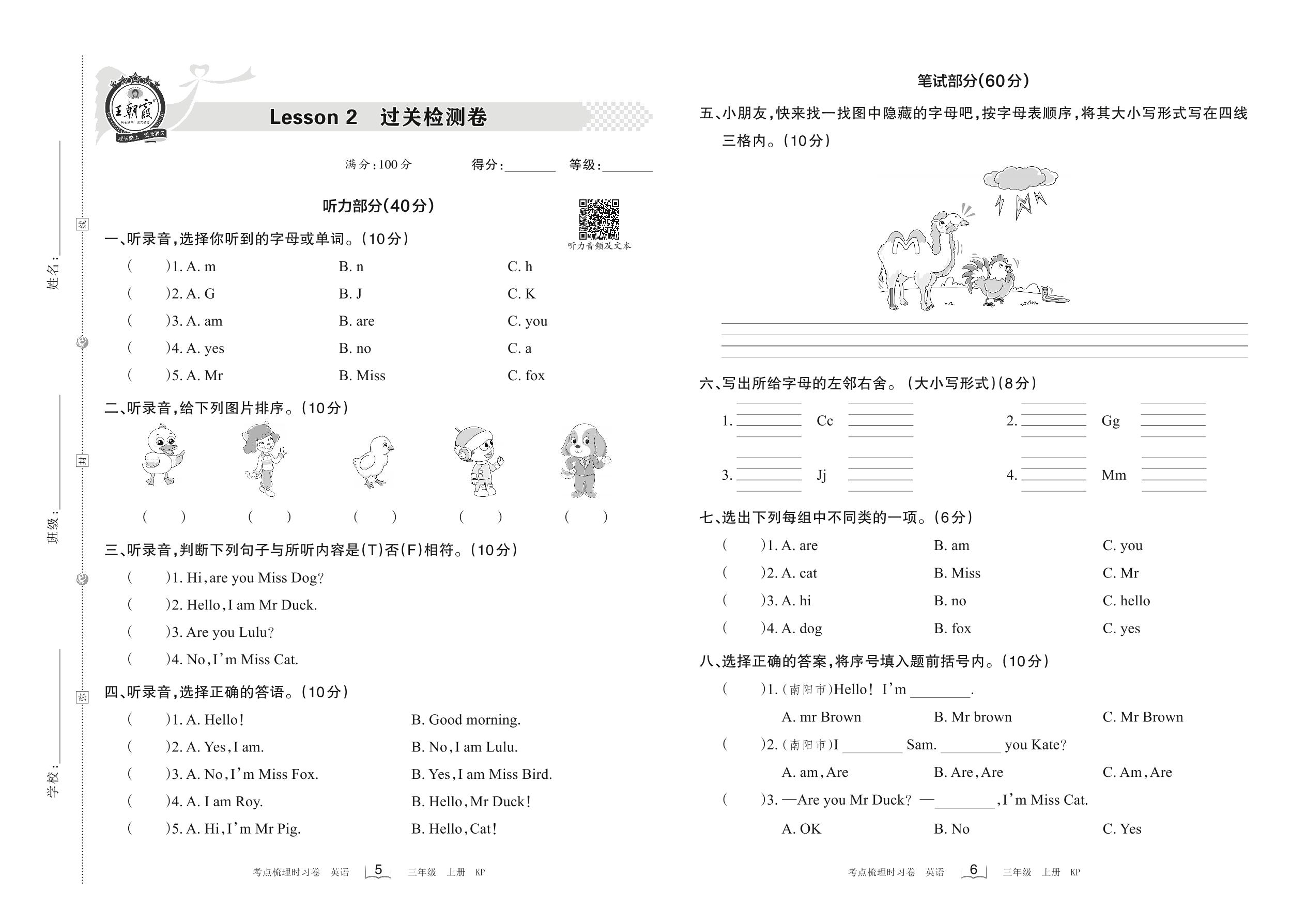 2022上册三年级英语科普版 Lesson 2 过关检测卷