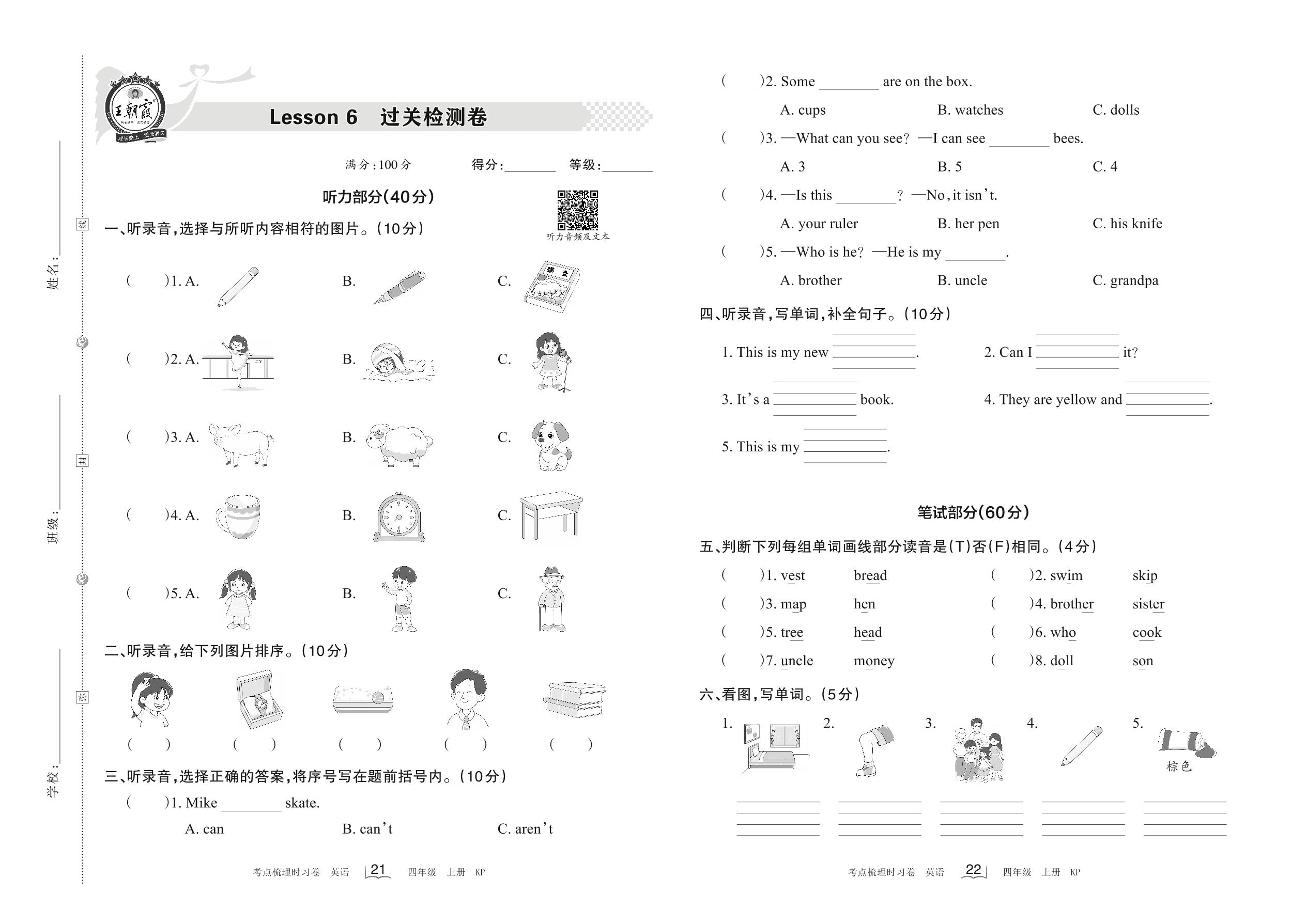 2022上册四年级英语科普版 Lesson 6 过关检测卷