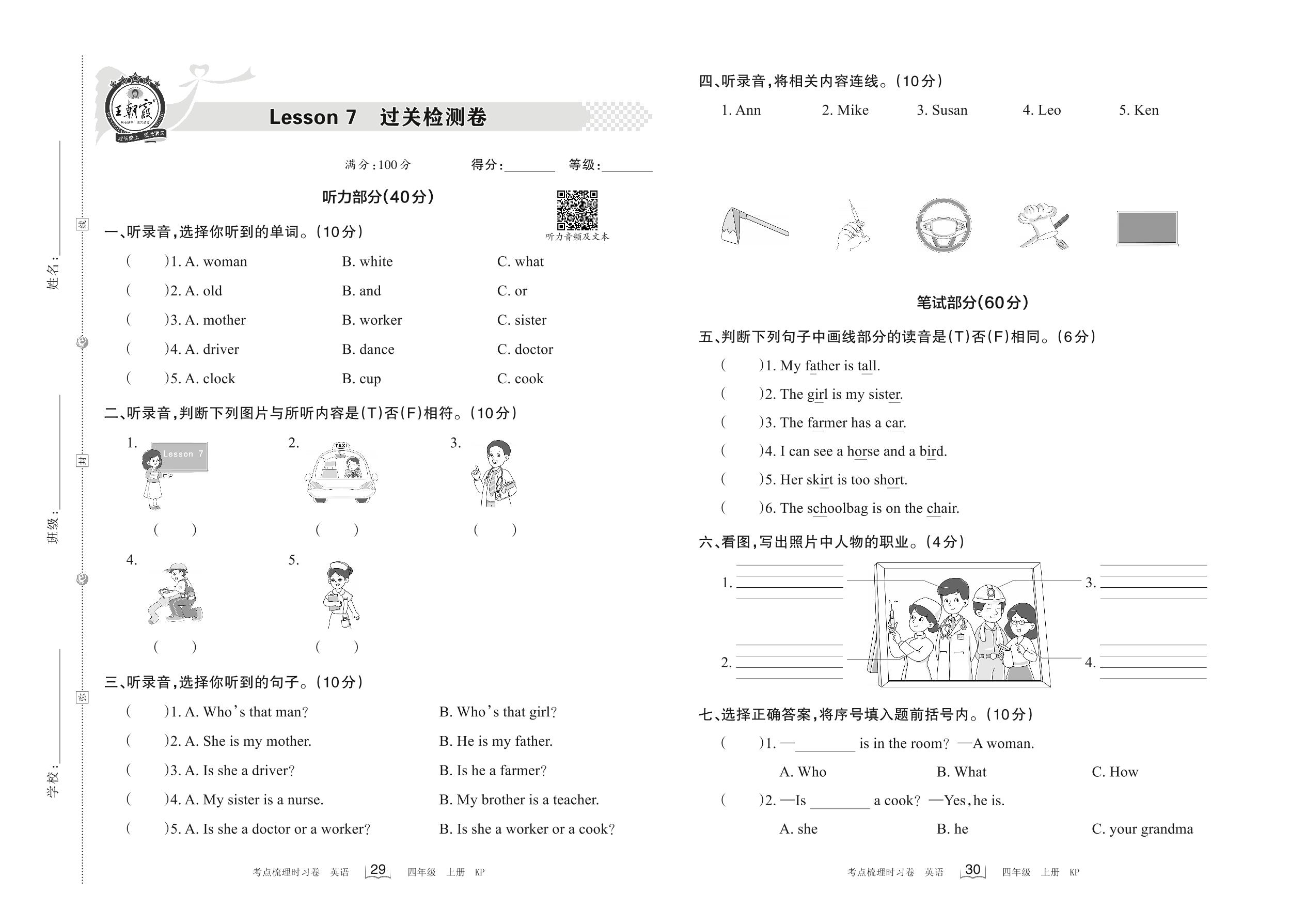 2022上册四年级英语科普版 Lesson 7 过关检测卷