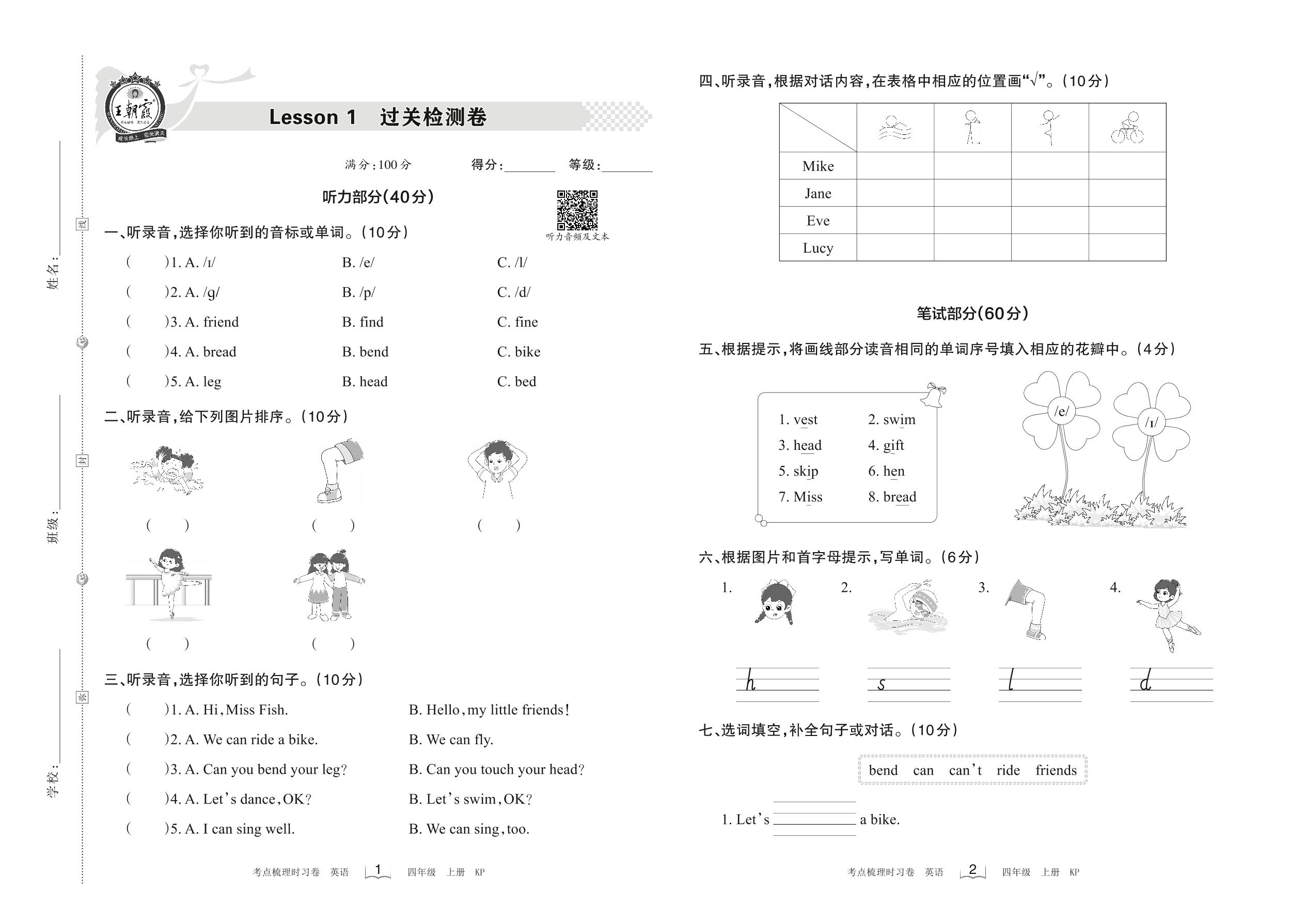 2022上册四年级英语科普版 Lesson 1 过关检测卷
