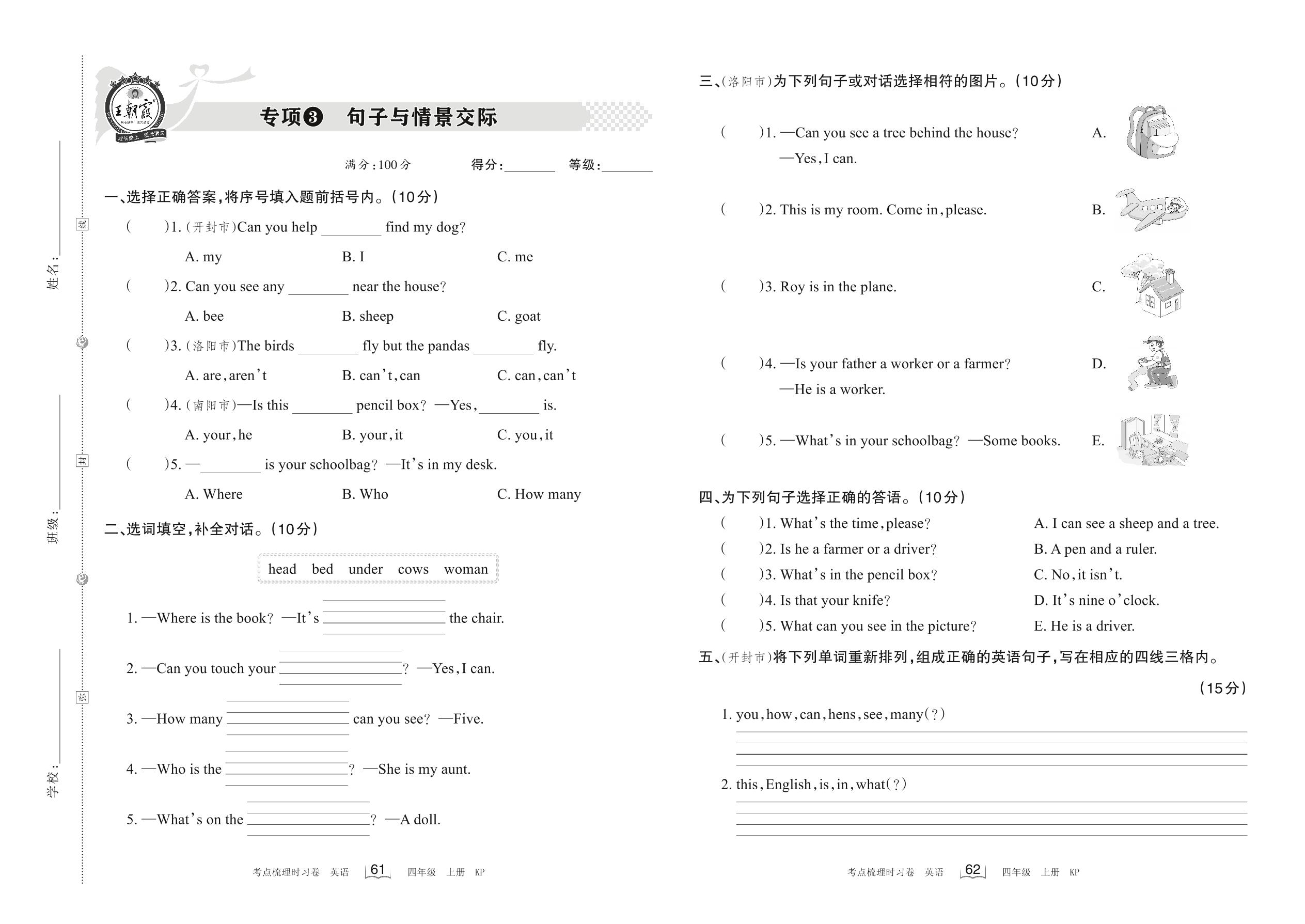2022上册四年级英语科普版 专项3 句子与情景交际