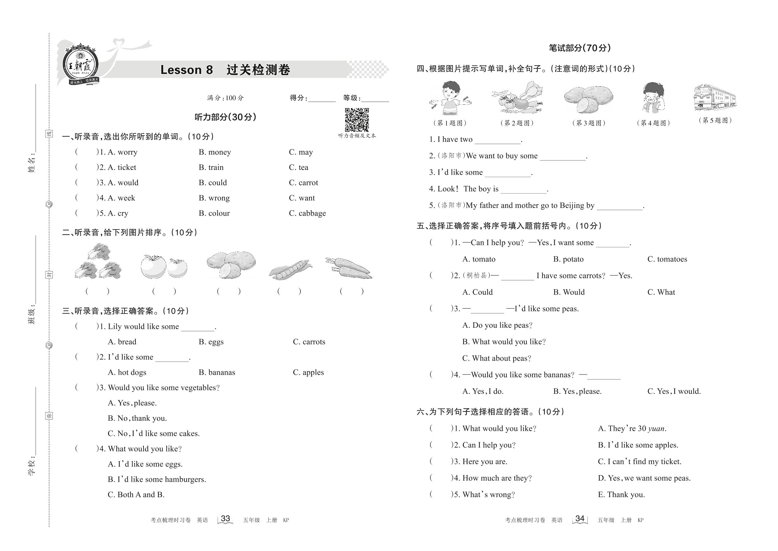 2022上册五年级英语科普版 Lesson 8 过关检测卷