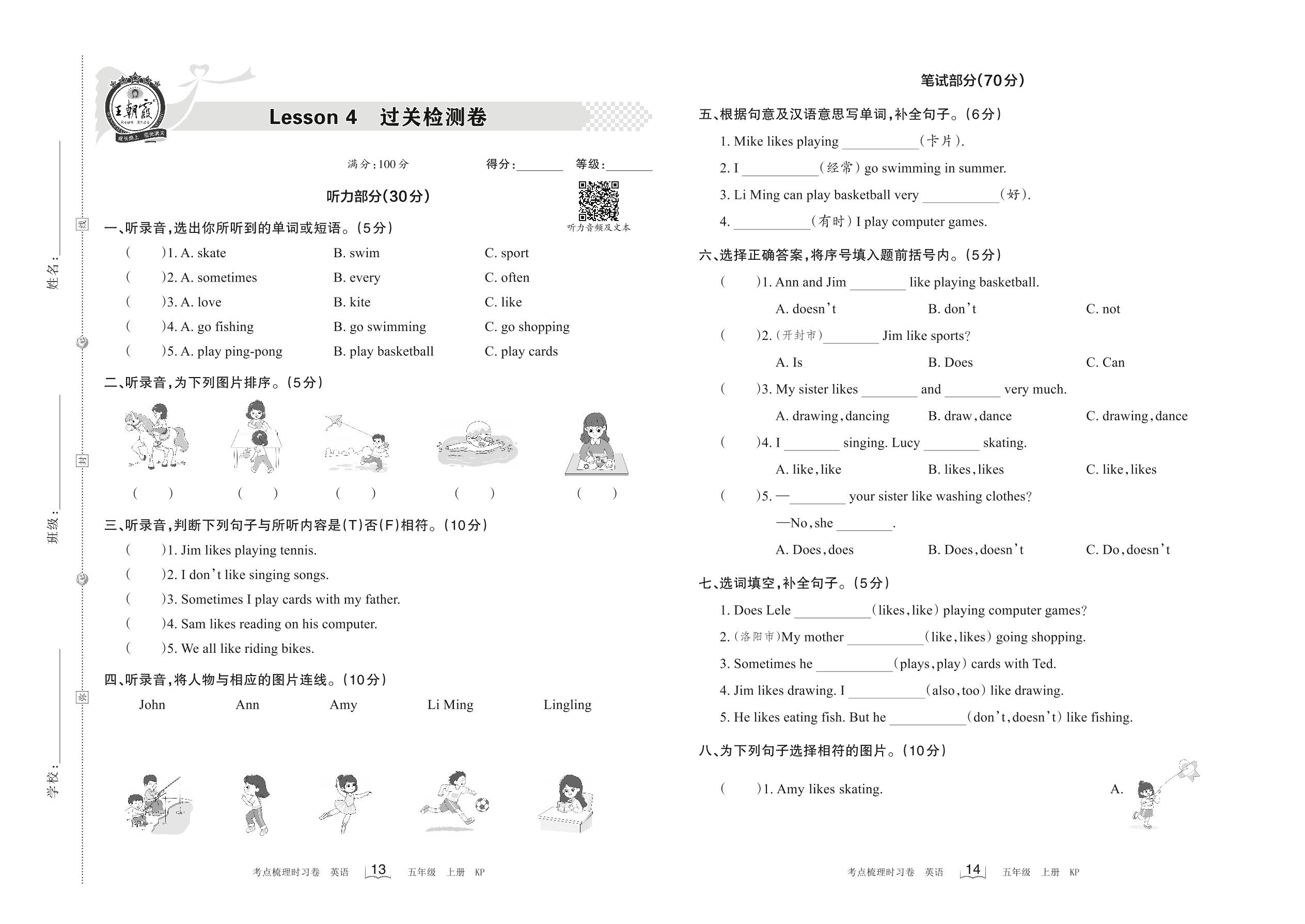 2022上册五年级英语科普版 Lesson 4 过关检测卷