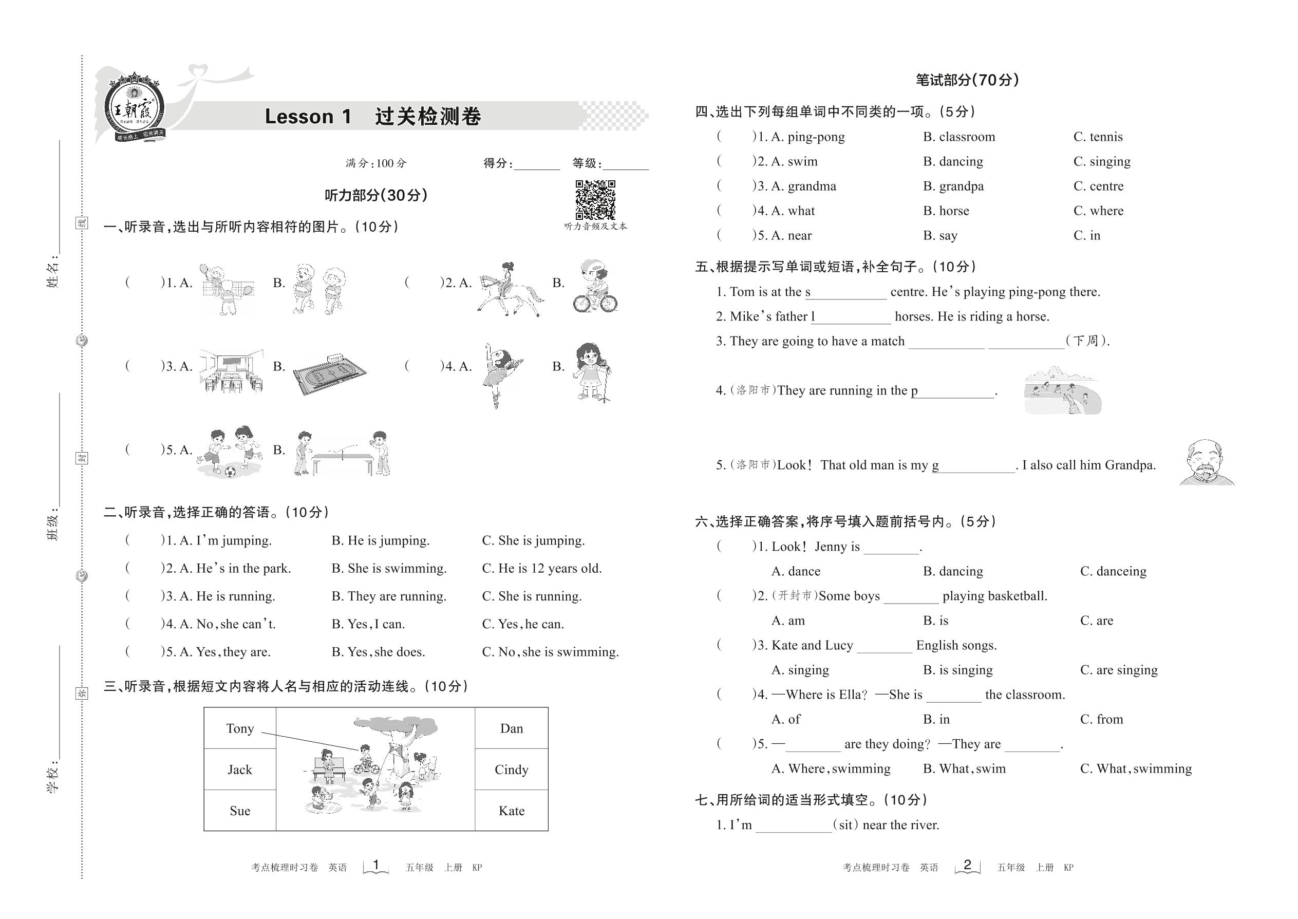 2022上册五年级英语科普版 Lesson 1 过关检测卷