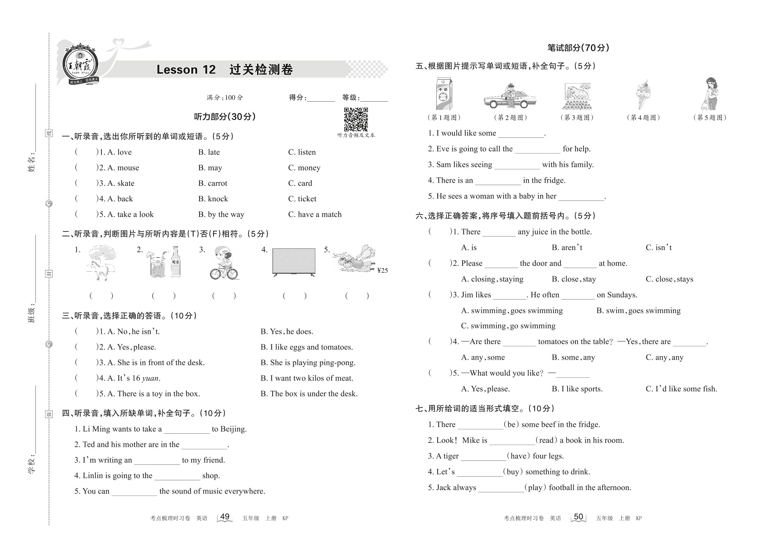 2022上册五年级英语科普版 Lesson 12 过关检测卷