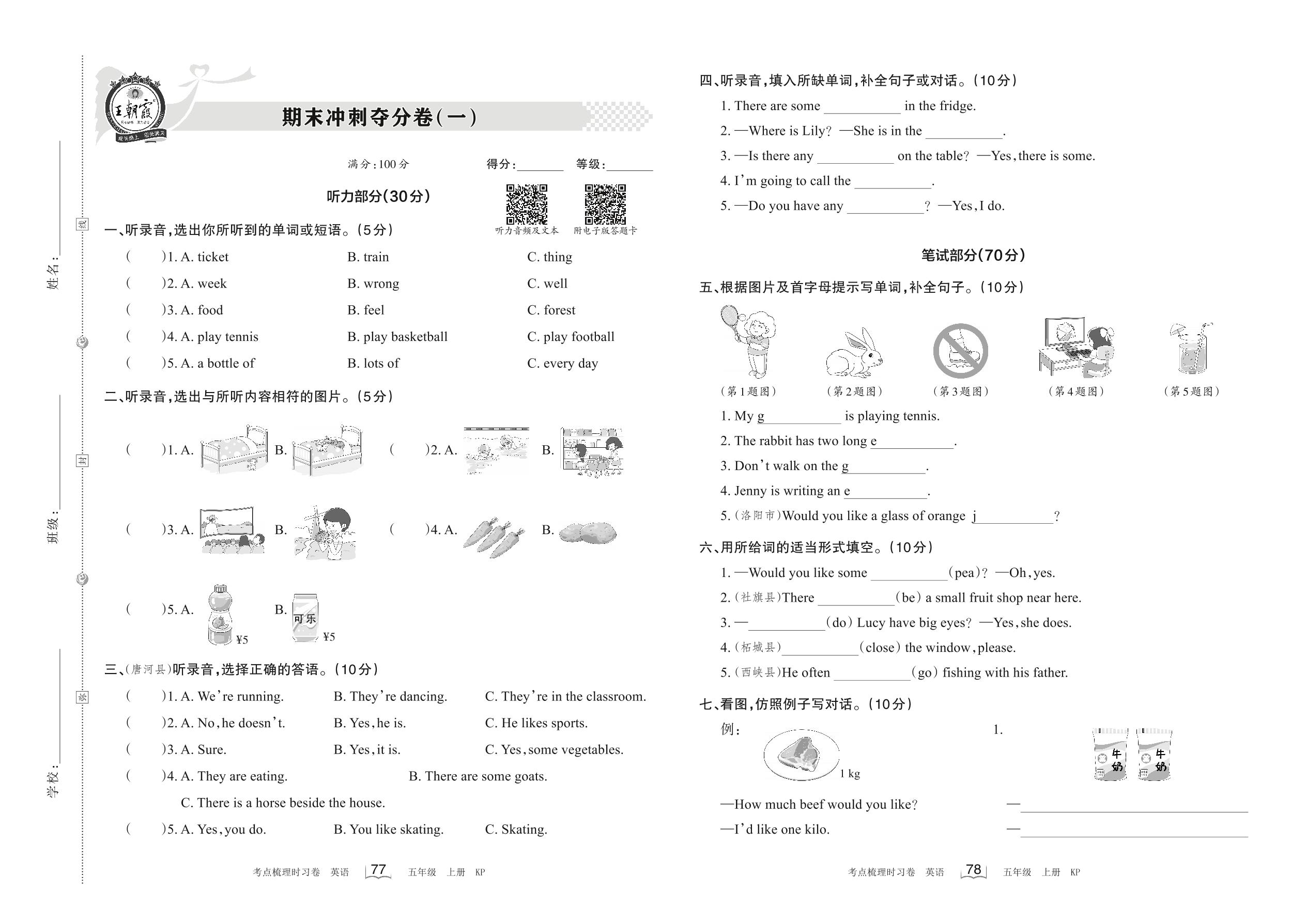 2022上册五年级英语科普版 期末冲刺夺分卷(一)