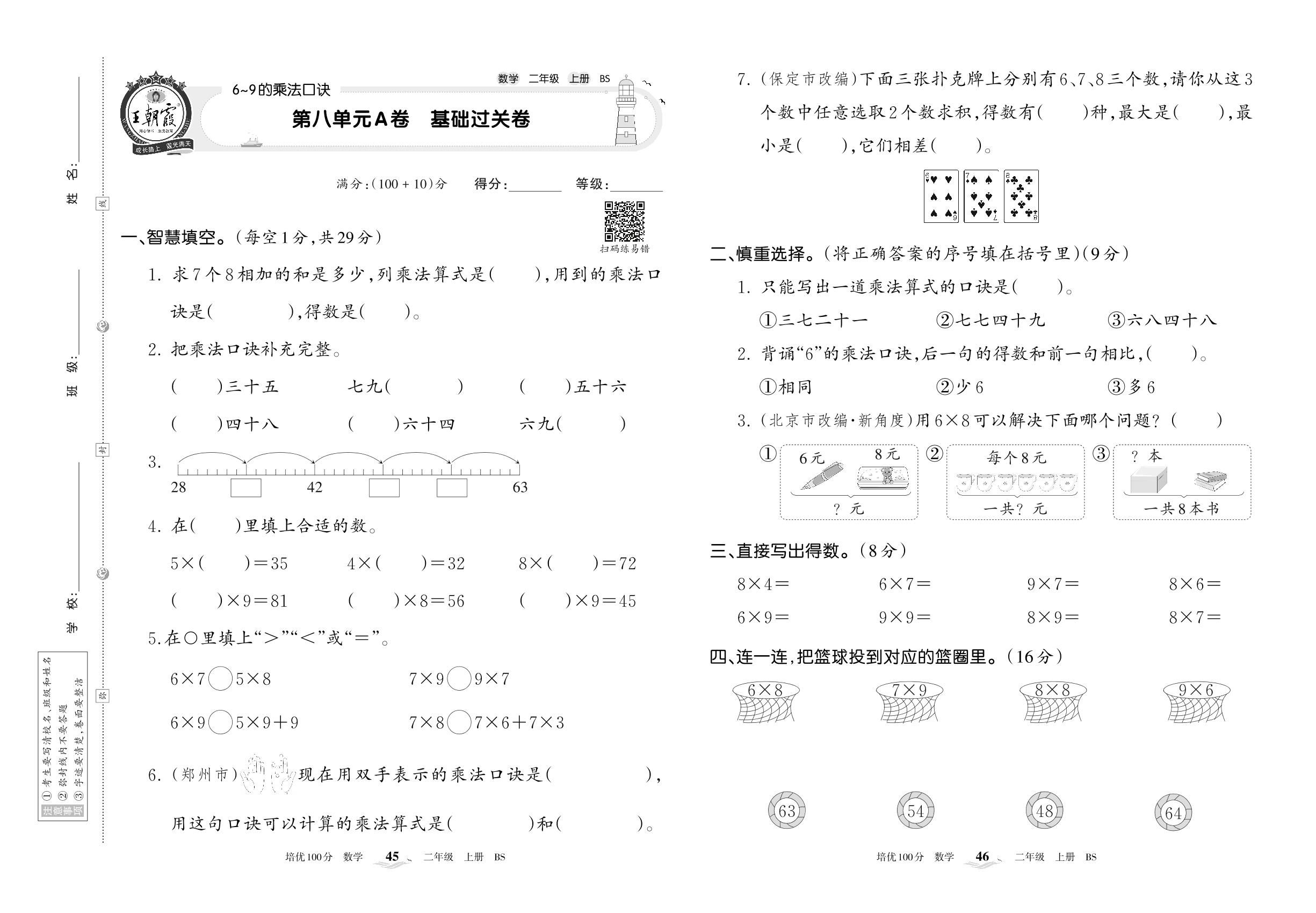 2022上册二年级数学北师版 第八单元A卷 基础过关卷