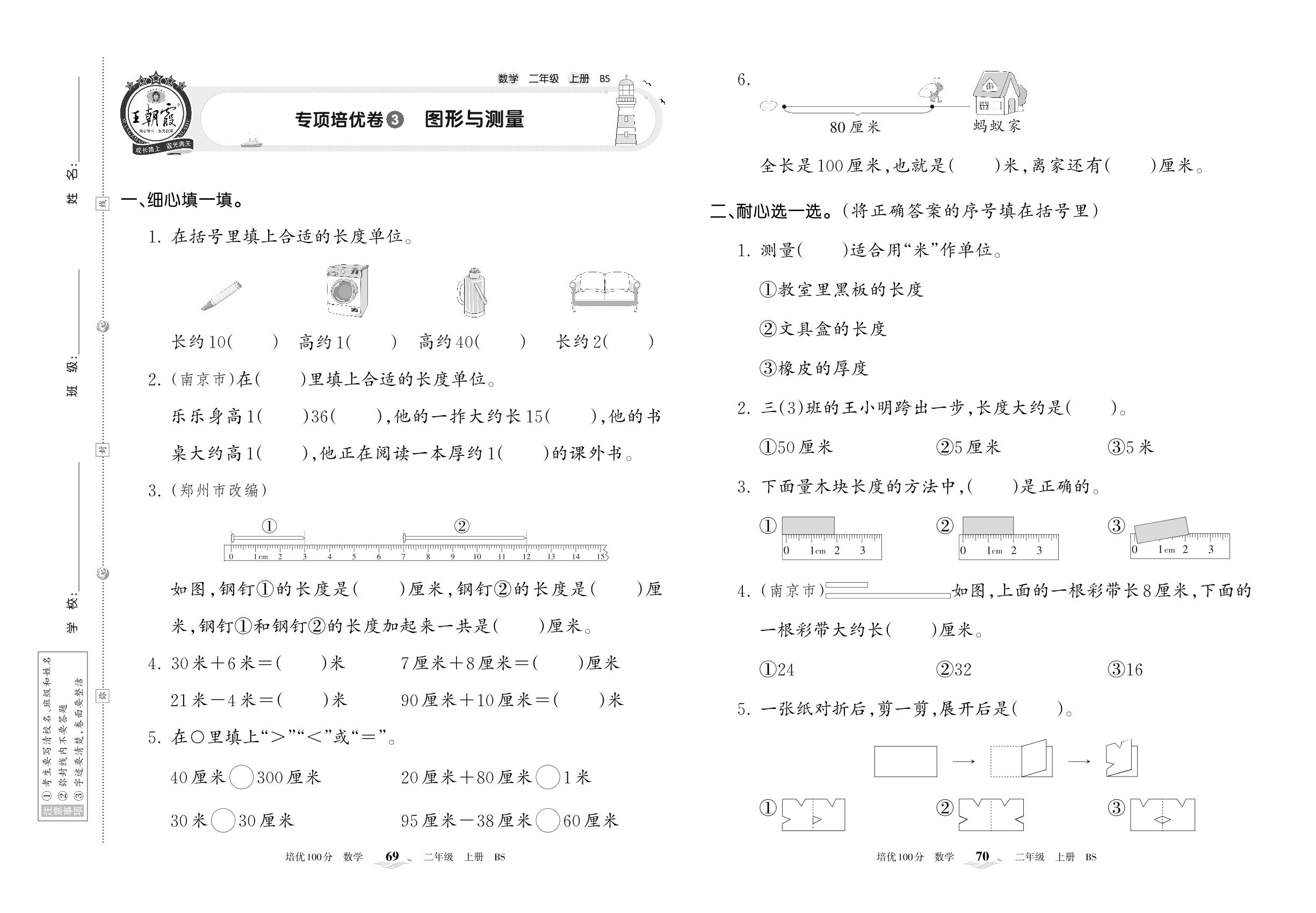 2022上册二年级数学北师版 专项培优卷3 图形与测量