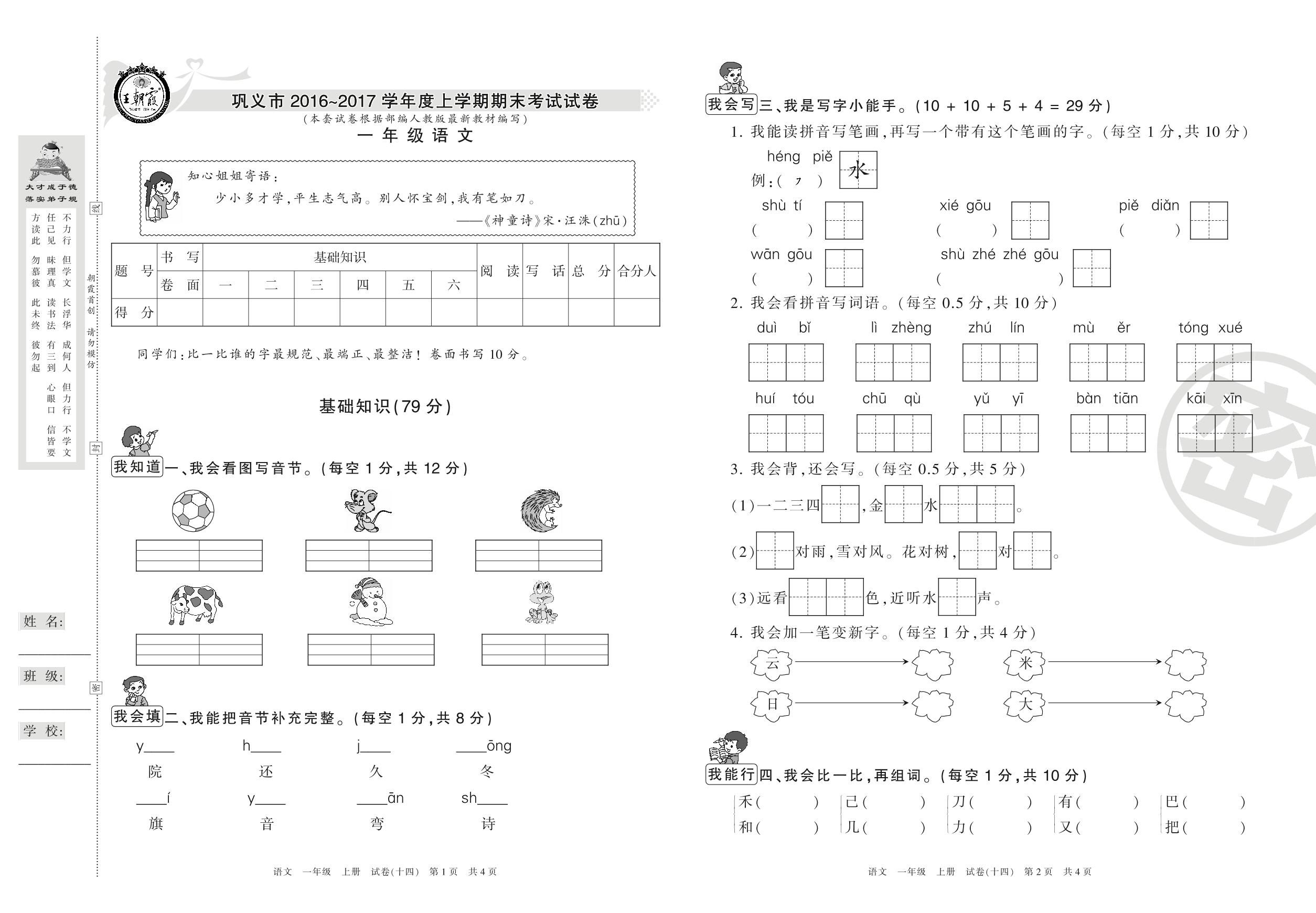 2016-2017学年第一学期巩义市一年级语文试卷(人教版)【14】