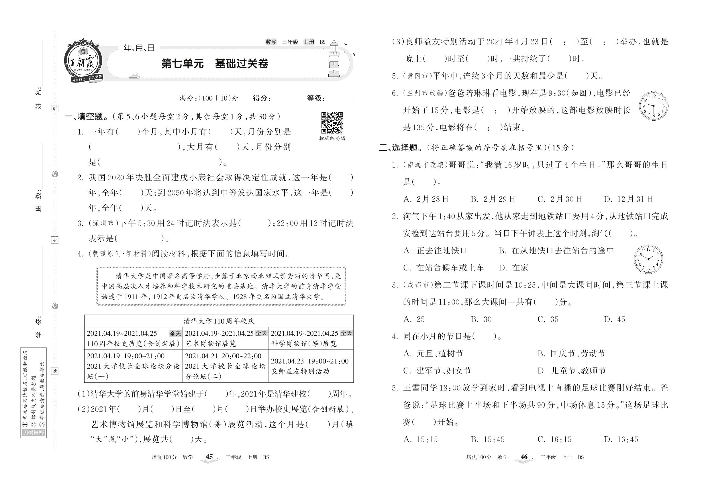 2022上册三年级数学北师版 第七单元 基础过关卷