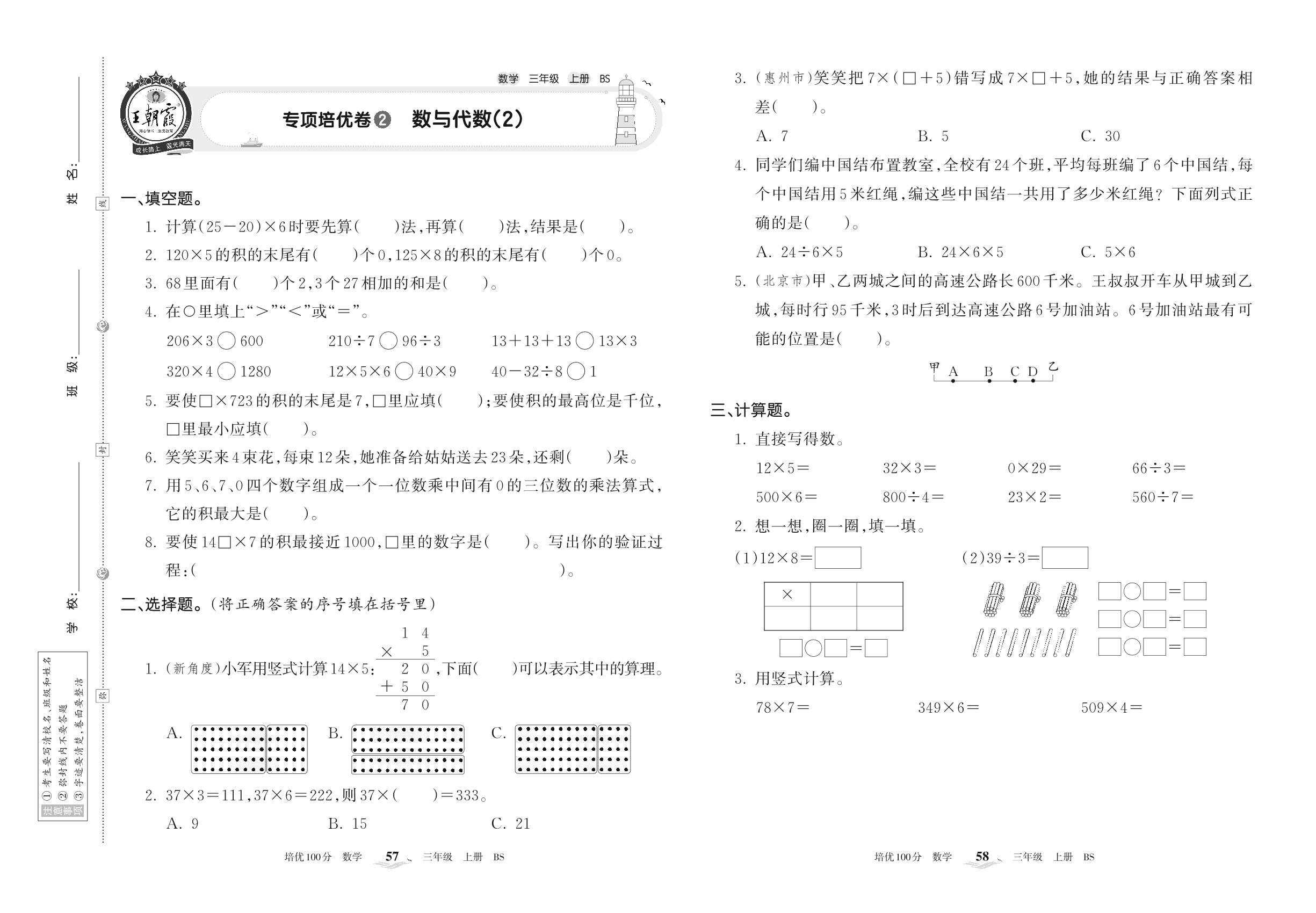 2022上册三年级数学北师版 专项培优卷2 数与代数(2)