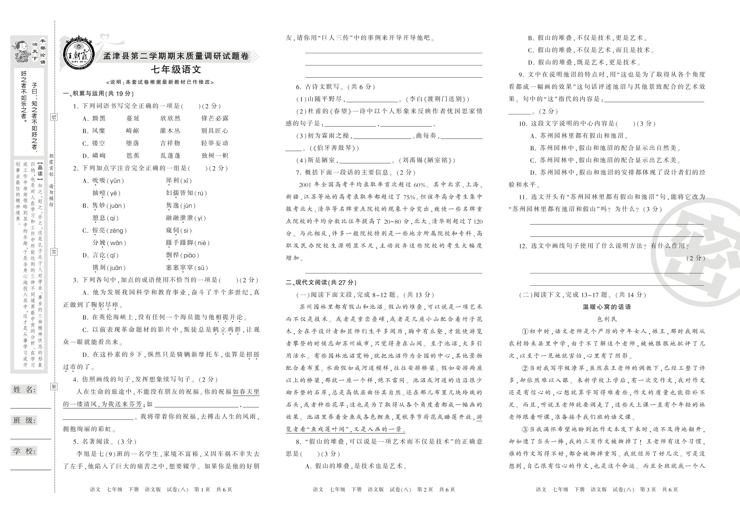 2015-2016学年第二学期洛阳市孟津县七年级语文试卷(语文版)【8】