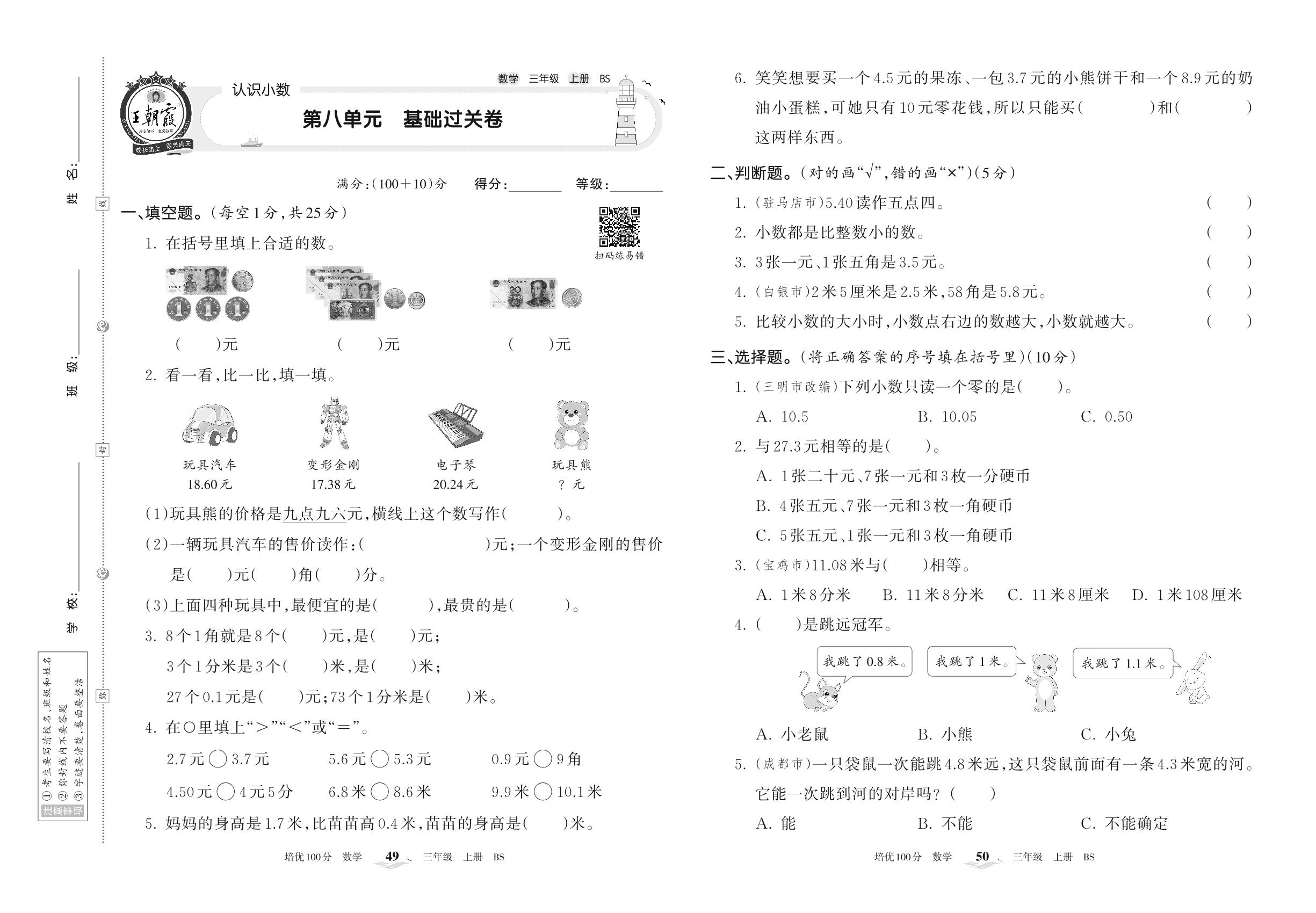 2022上册三年级数学北师版 第八单元 基础过关卷