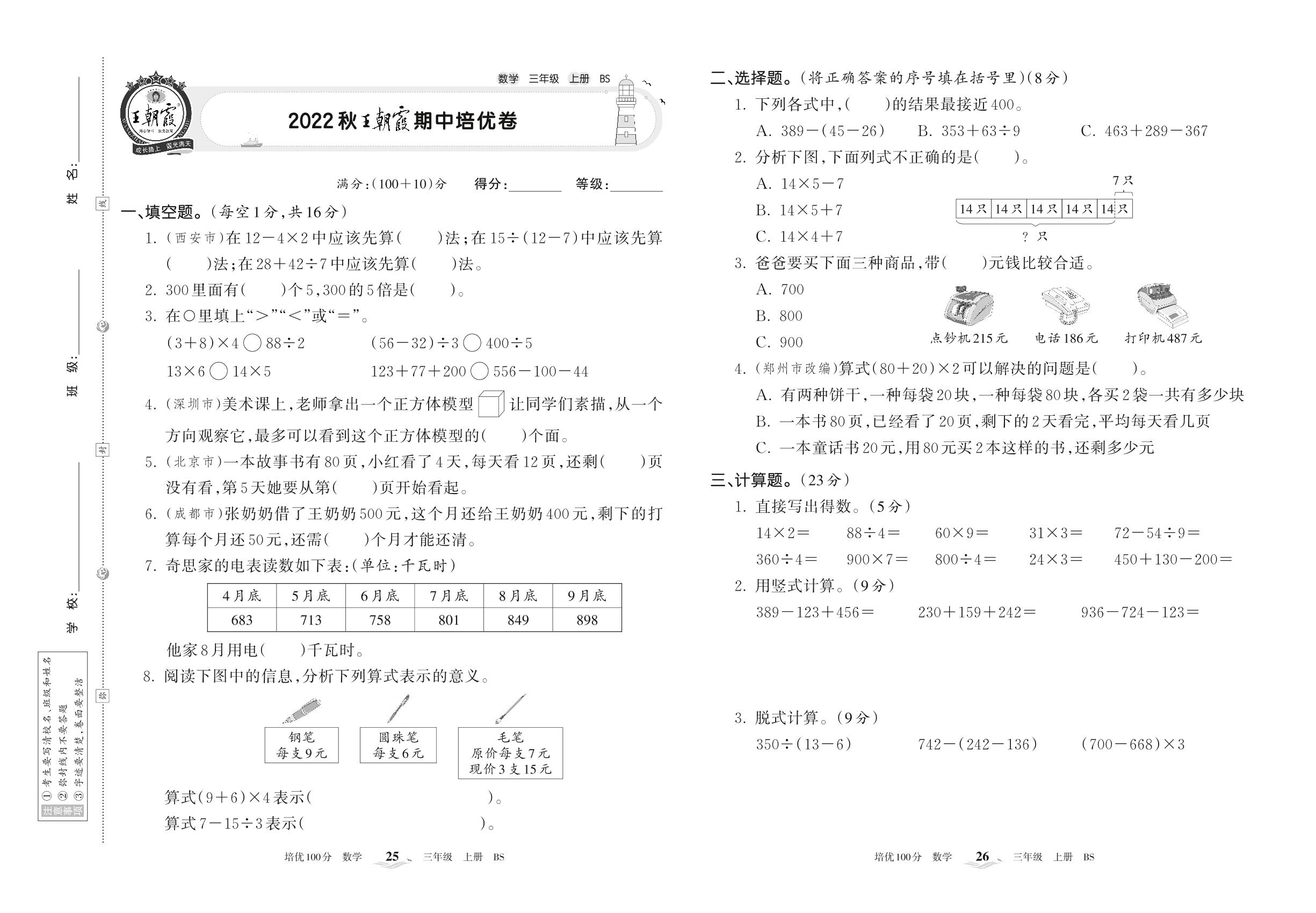 2022上册三年级数学北师版 2022秋王朝霞期中培优卷