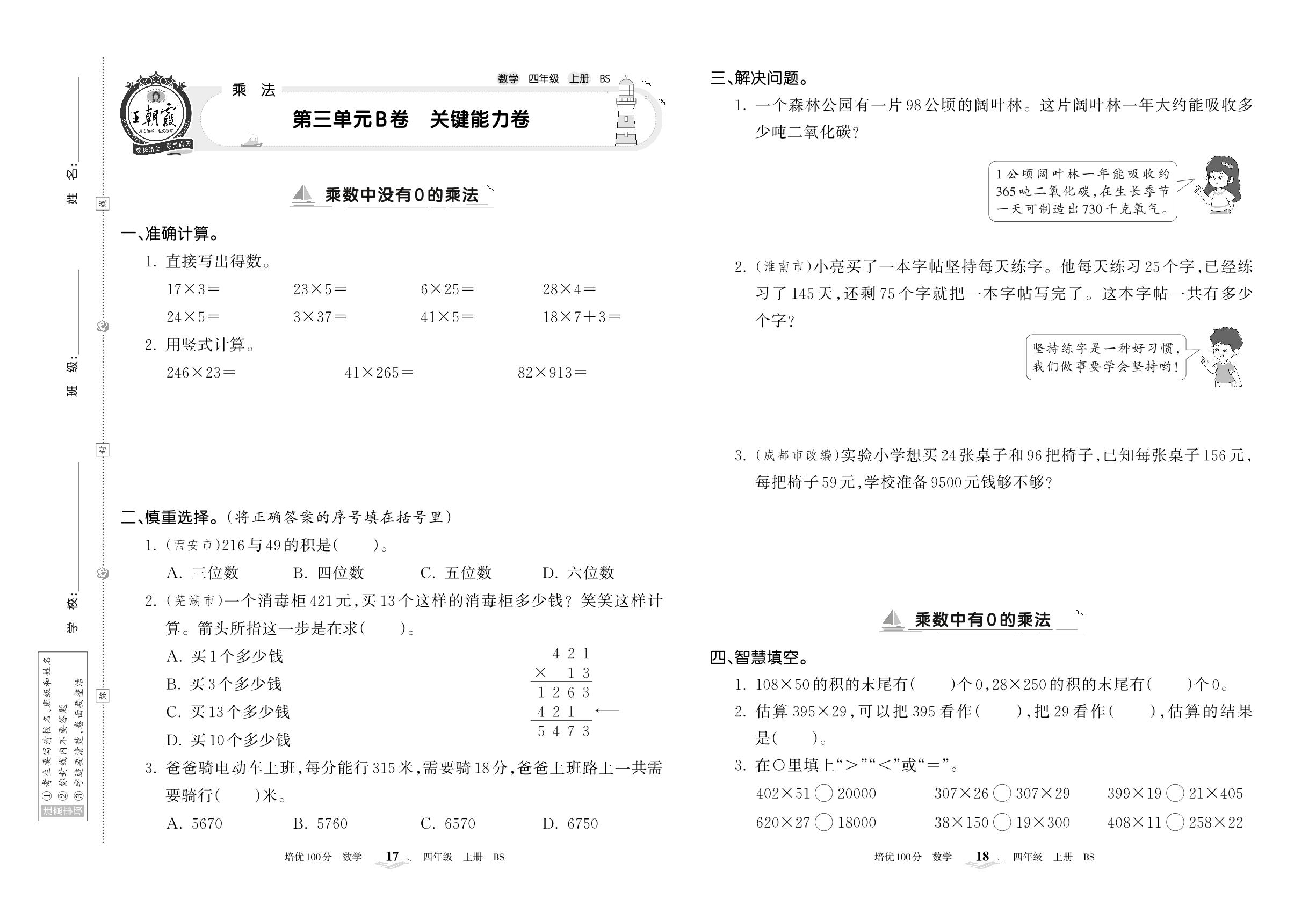 2022上册四年级数学北师版 第三单元B卷 关键能力卷