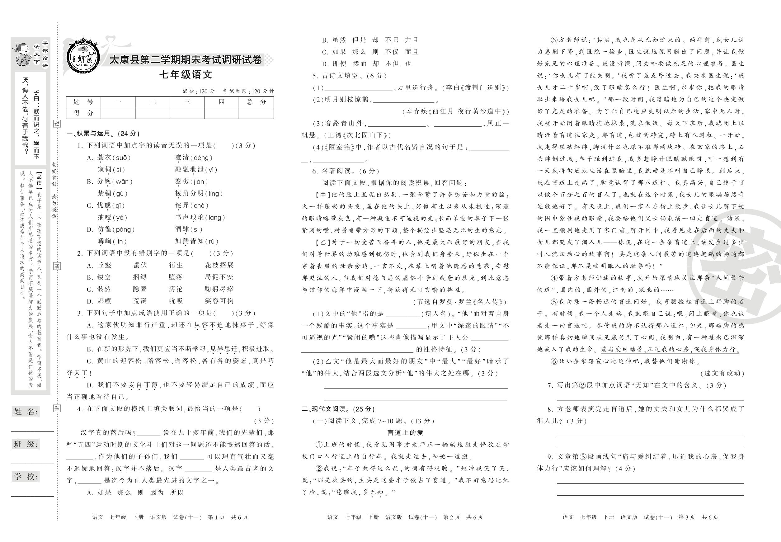 2015-2016学年第二学期周口市太康县七年级语文试卷(语文版)【11】