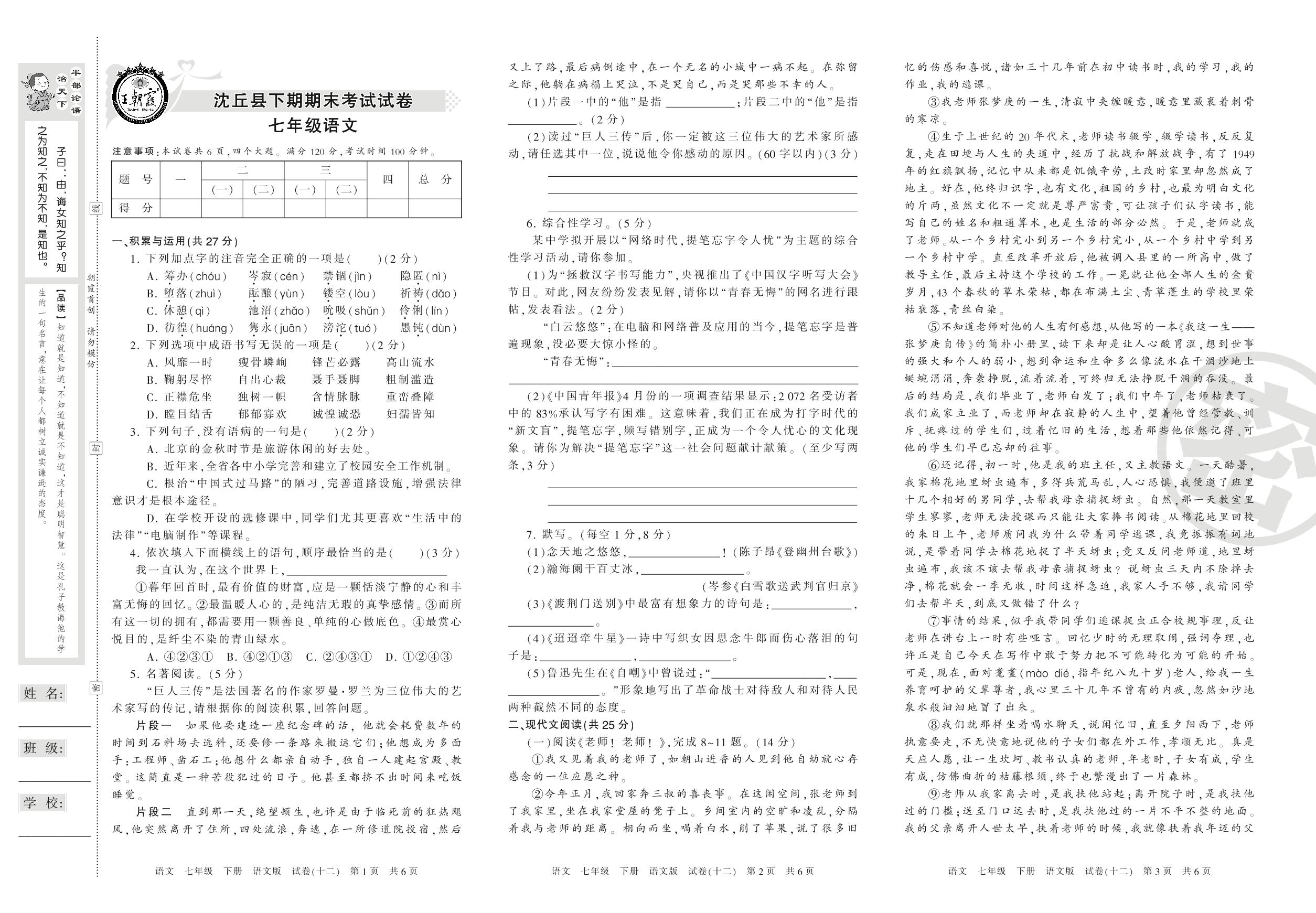 2015-2016学年第二学期周口市沈丘县七年级语文试卷(语文版)【12】