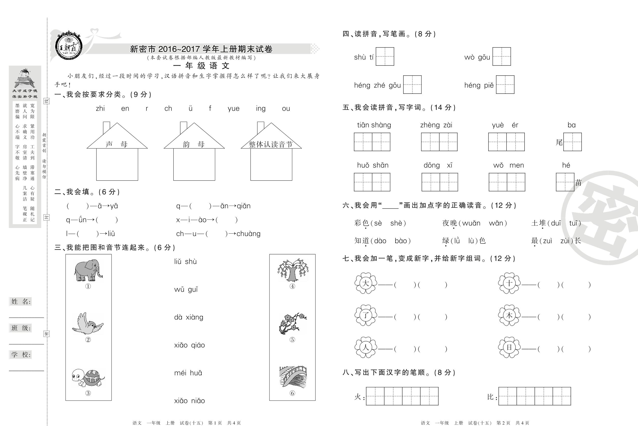 2016-2017学年第一学期新密市一年级语文试卷(人教版)【15】