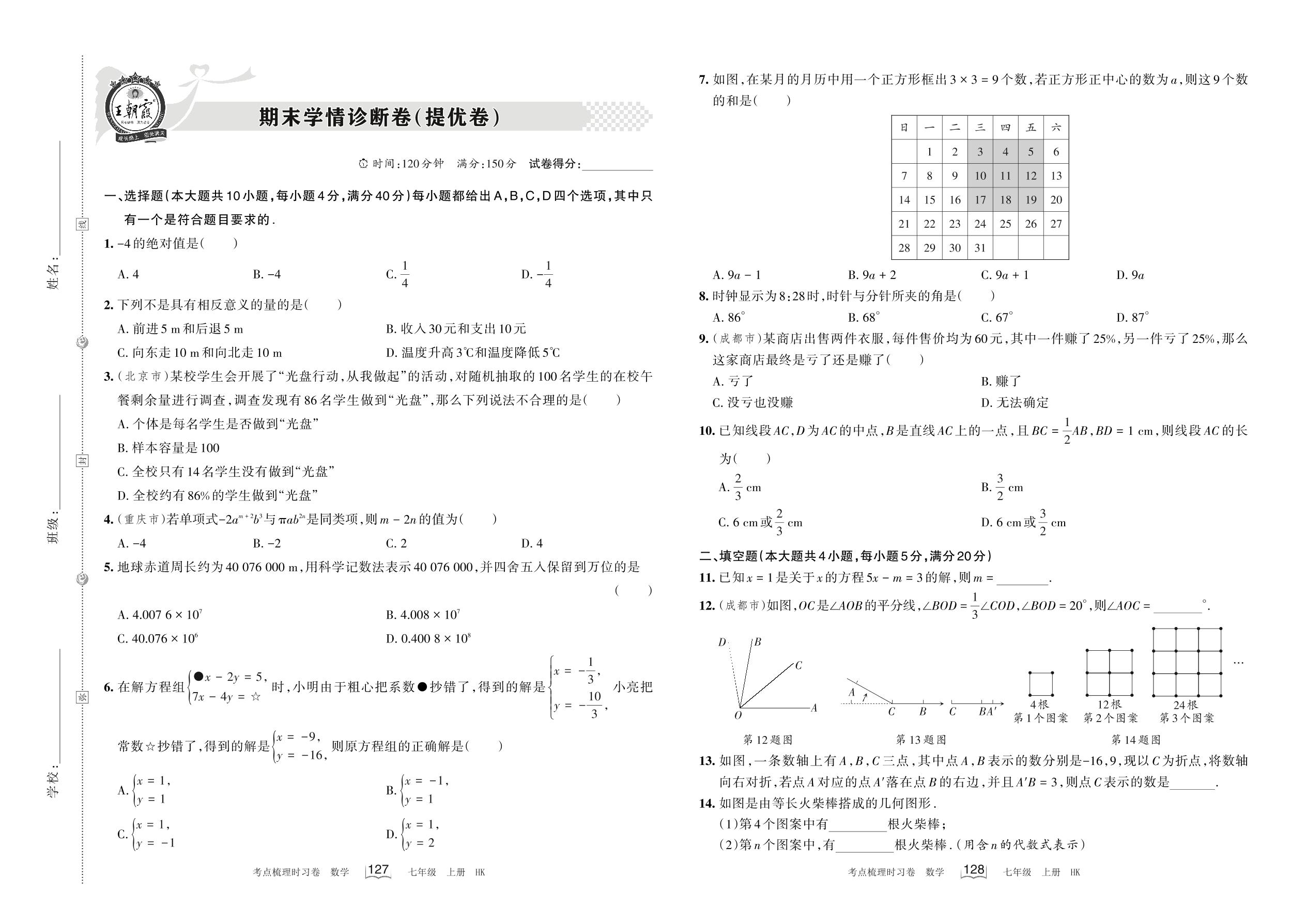 七年级数学沪科版上册期末卷