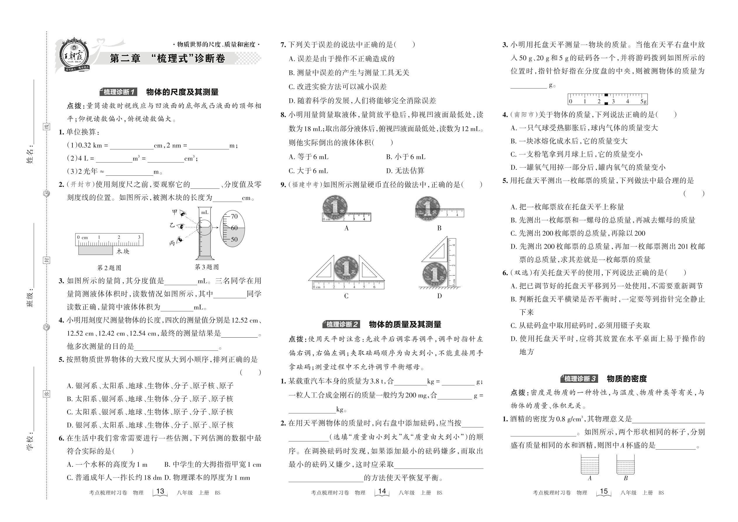 2022上册八年级物理北师版 第二章 “梳理式”诊断卷