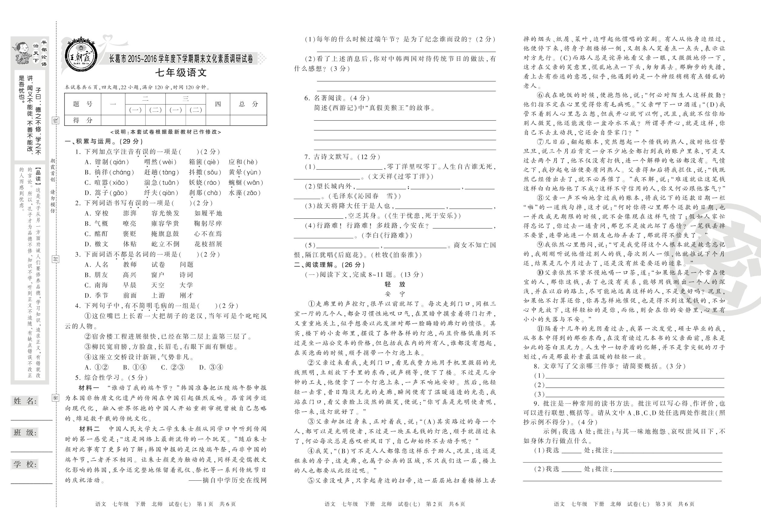 2015-2016学年第二学期长葛市七年级语文试卷(北师版)【7】
