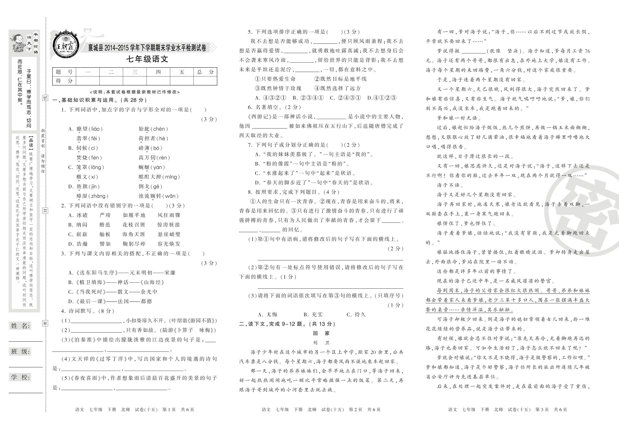 2014-2015学年第二学期许昌市襄城县七年级语文试卷(北师版)【15】